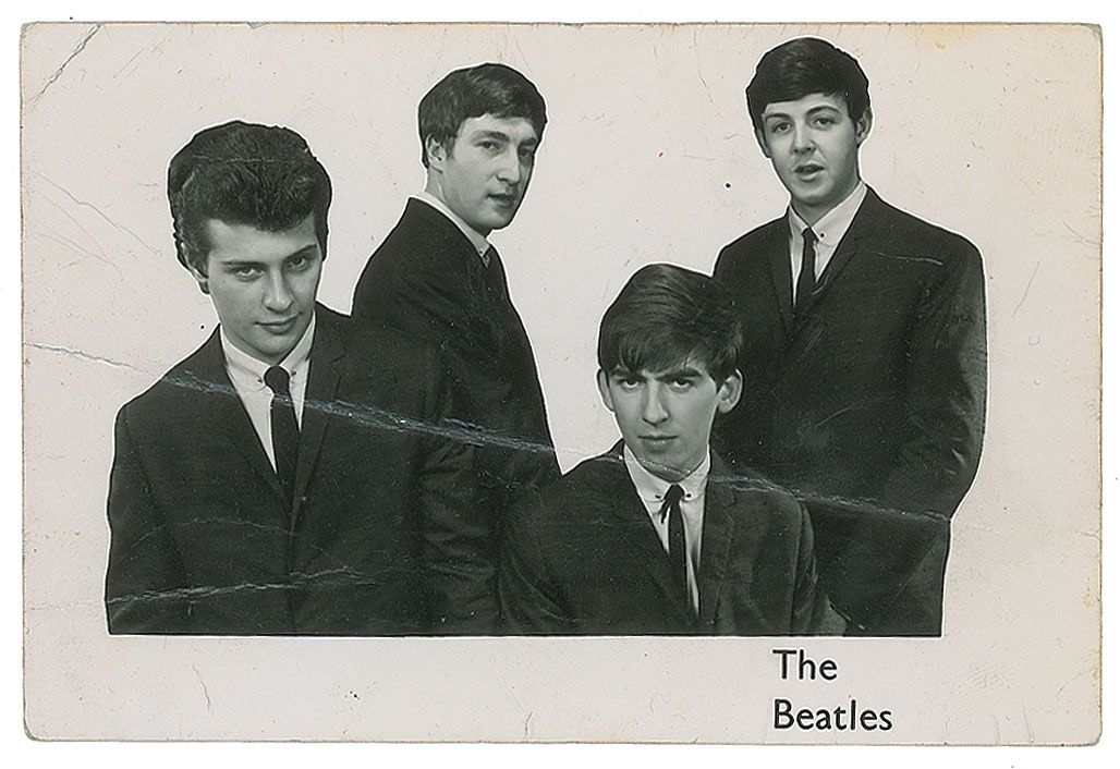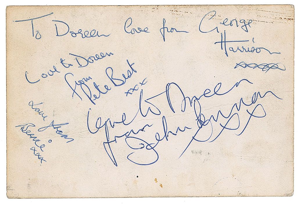 Rare vintage 5.25 x 3.5 promo card photo of the Beatles, with Pete Best as the drummer, taken in March of 1962, signed and inscribed on the reverse in blue ballpoint, “To Doreen, love from George Harrison xxxxx,” “Love to Doreen from Pete Best xxx,” and “Love to Doreen from John Lennon.” Card is also signed and inscribed, “Love from Bernie xxx.” In very good to fine condition, with scattered toning and soiling to reverse, scattered creases to both sides, with a horizontal crease passing through a small portion of Lennon’s signature, and impressions to image from signatures on reverse. Signatures were obtained after the band’s concert at the Majestic Ballroom in Crewe on August 13, 1962, and are accompanied by photocopies of two photos showing the recipient, Doreen, with members of the band. Just three days later, Pete Best would be dismissed by the band and replaced by Ringo Starr.