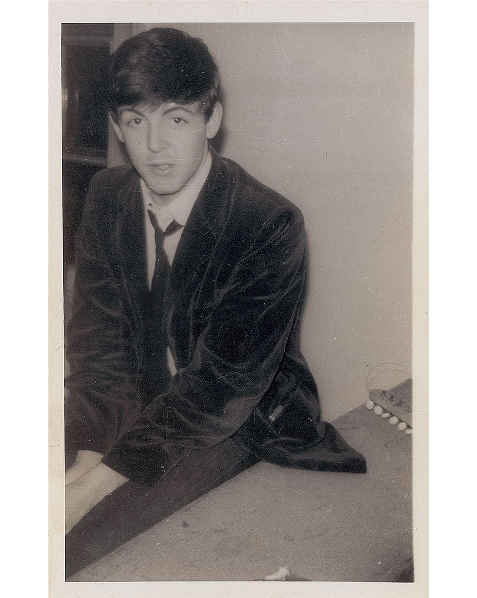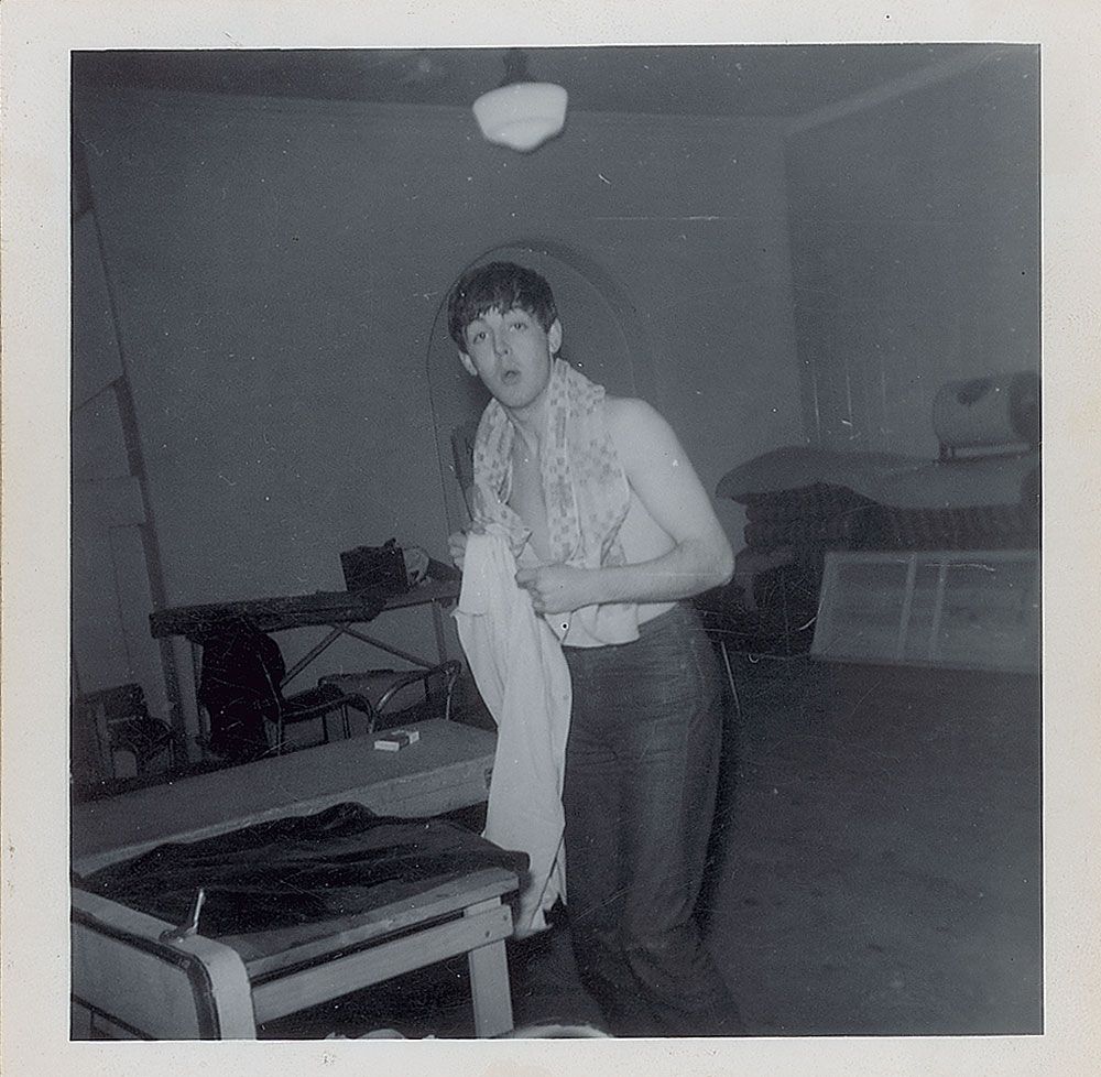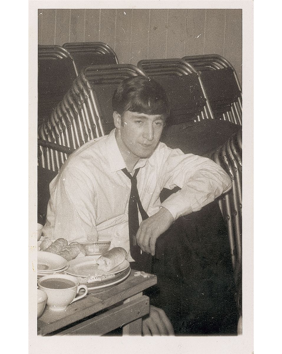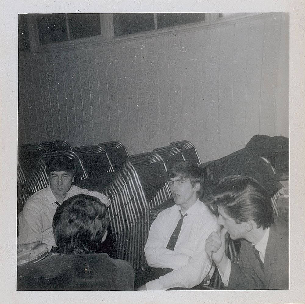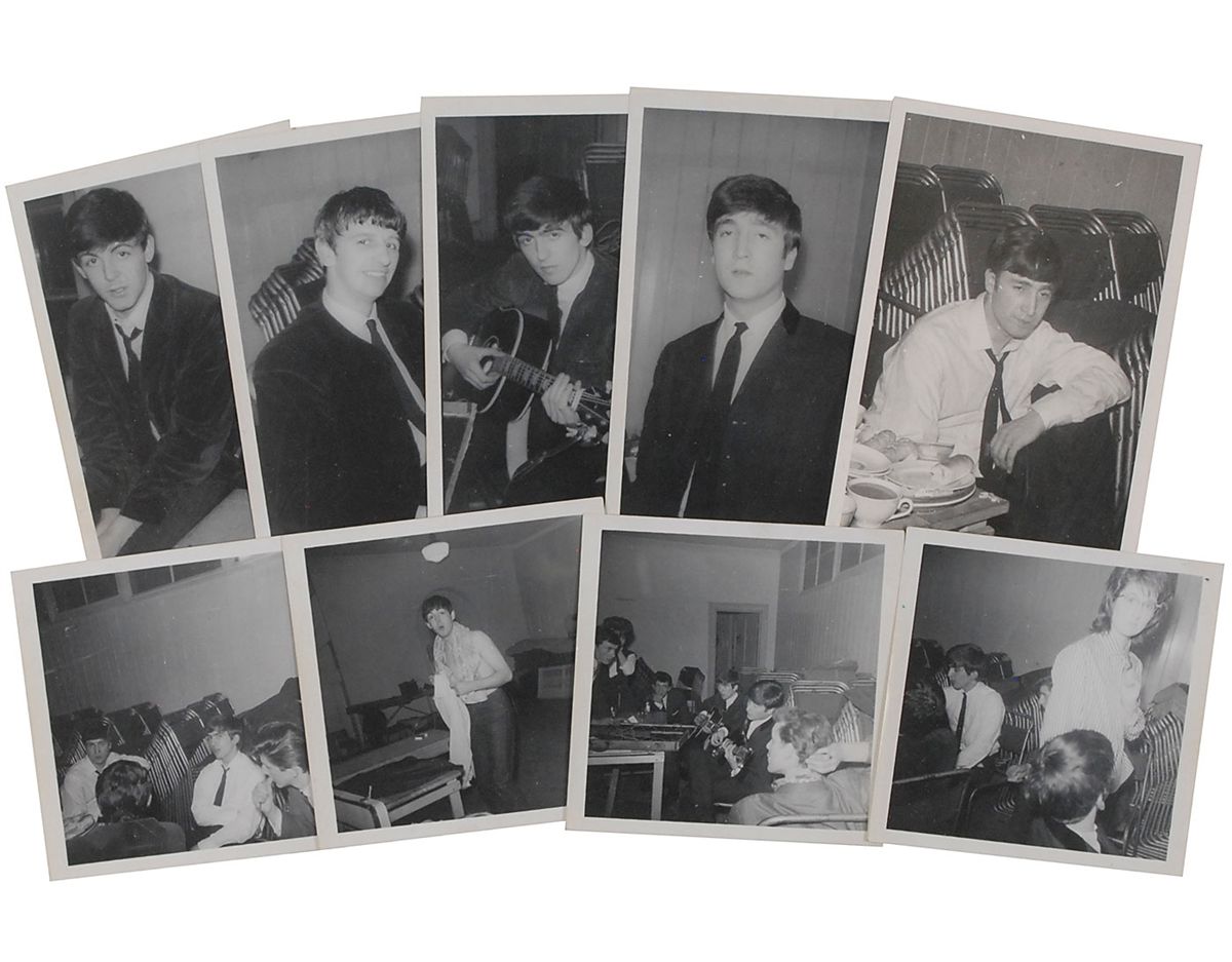 Collection of nine candid glossy snapshots of the Beatles, ranging in size from 3.5 x 3.5 up to 3.5 x 5.5, all taken backstage before and after their show at the Shrewsbury Music Hall on April 26, 1963. Photos include four 3.5 x 3.5, including a shirtless Paul McCartney with a towel draped over his neck and another showing John Lennon and George Harrison playing their guitars; 3.25 x 5 individual photos of each band member in a dark suit and tie, with Harrison picking at an acoustic guitar, and Ringo raising a glass; and a 3.5 x 5.5 image of John Lennon at a table covered in coffee and pastry. In overall fine condition. Photos were originally taken by a female news reporter who was granted backstage access; she also appears in one photo offered in this group. She later took orders for copies of the photos, making an extra copy of the shirtless McCartney, which she sent him for his 21st birthday. As Beatlemania took over, access to the band soon became very restricted, making any glimpse of the band out of the limelight highly desirable.