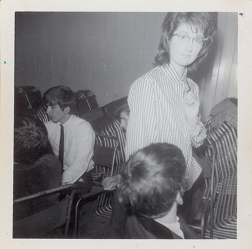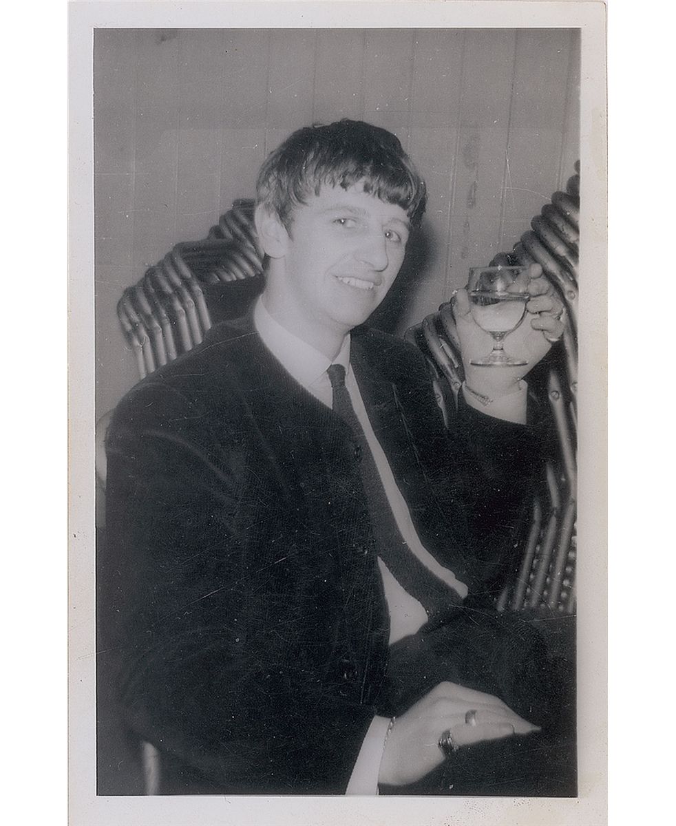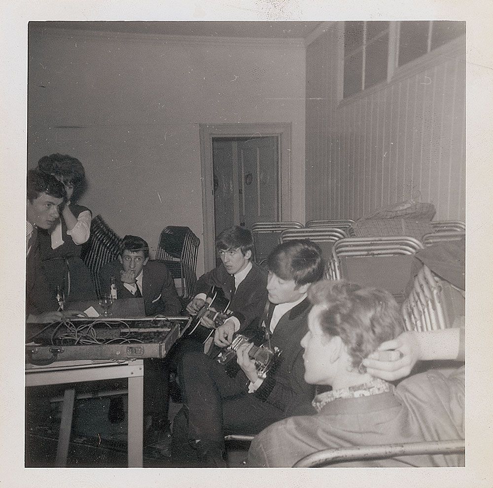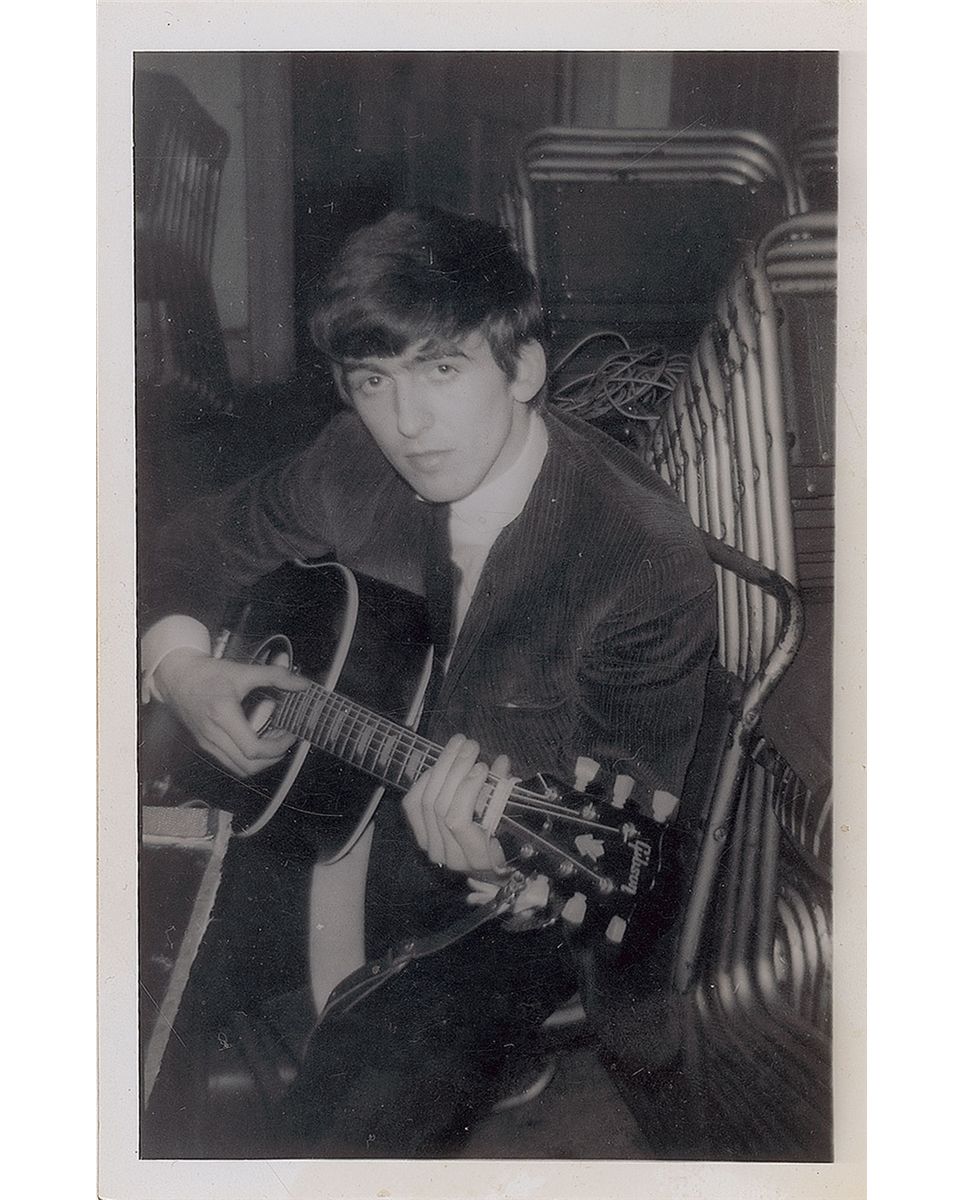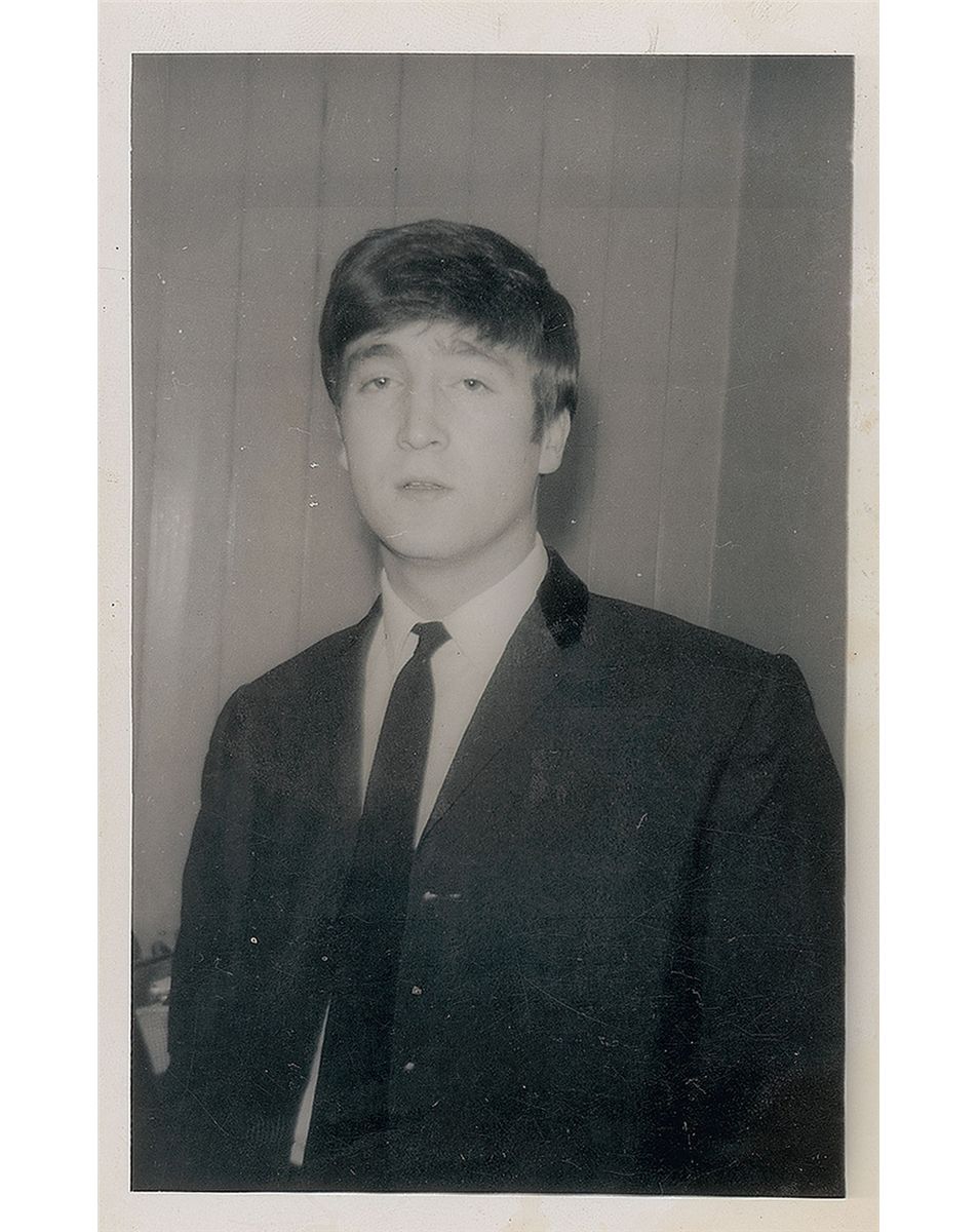 Collection of nine candid glossy snapshots of the Beatles, ranging in size from 3.5 x 3.5 up to 3.5 x 5.5, all taken backstage before and after their show at the Shrewsbury Music Hall on April 26, 1963. Photos include four 3.5 x 3.5, including a shirtless Paul McCartney with a towel draped over his neck and another showing John Lennon and George Harrison playing their guitars; 3.25 x 5 individual photos of each band member in a dark suit and tie, with Harrison picking at an acoustic guitar, and Ringo raising a glass; and a 3.5 x 5.5 image of John Lennon at a table covered in coffee and pastry. In overall fine condition. Photos were originally taken by a female news reporter who was granted backstage access; she also appears in one photo offered in this group. She later took orders for copies of the photos, making an extra copy of the shirtless McCartney, which she sent him for his 21st birthday. As Beatlemania took over, access to the band soon became very restricted, making any glimpse of the band out of the limelight highly desirable.