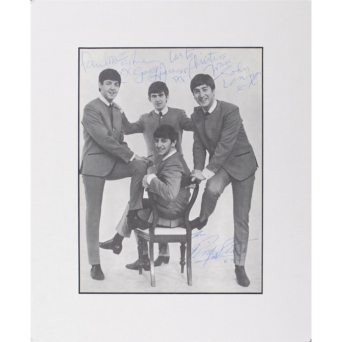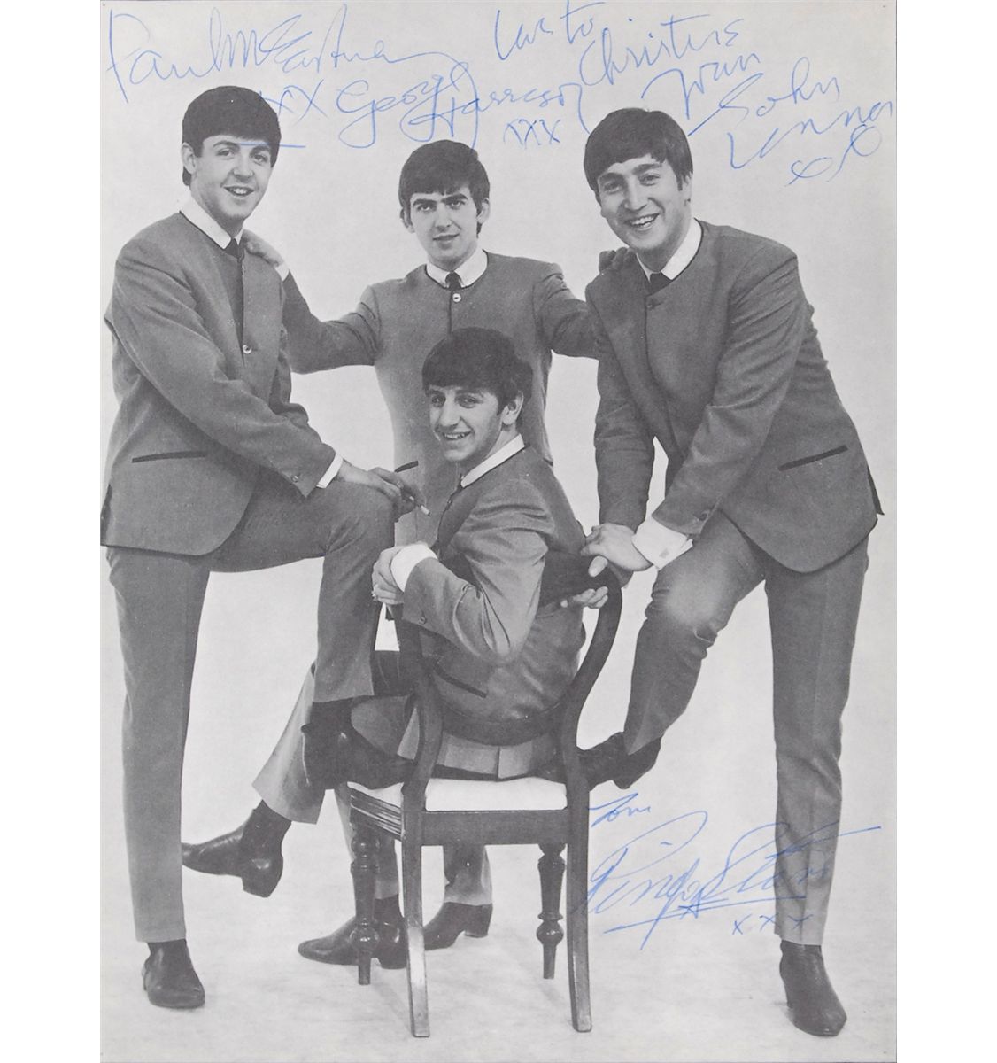Absolutely magnificent vintage 7 x 9.5 program photo by Dezo Hoffman of the band looking sharp in their matching iconic collarless suits in the spring of 1963, signed and inscribed in fountain pen “Love to Christine from John Lennon xx,” “George Harrison xxx,” “Paul McCartney xxx,” and “Love, Ringo Starr xxx.” Matted to an overall size of 11 x 13.5. In fine, clean condition. Accompanied by a letter of authenticity from noted Beatles expert Frank Caiazzo. Signatures were obtained between August 19–24, 1963, in Bournemouth, Hampshire, for a young female fan who was invited to meet the group back stage after winning a Disc magazine contest, during their six-day engagement at the Gaumont Cinema. A stellar example of one of their most famous images, almost unparalleled in its condition, boasting bold and unhurried signatures.