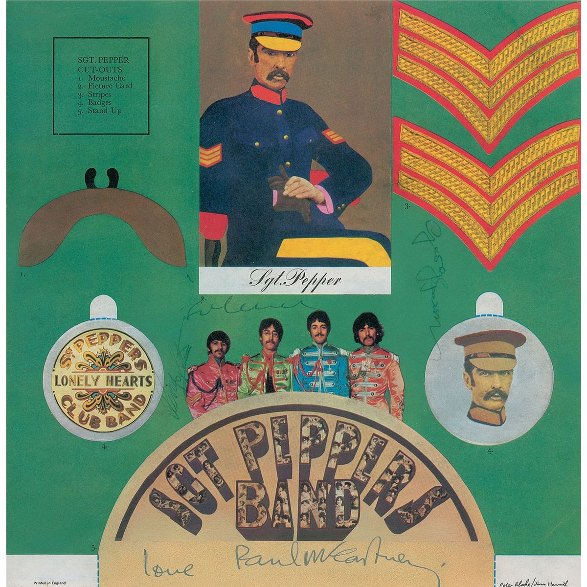 Virtually nonexistent color cut-out insert from Sgt. Peppers Lonely Hearts Club band, 12 x 12, signed in fountain pen by John Lennon, Ringo Starr, and George Harrison, and signed in fountain pen along the bottom of cut-out number five, “Love, Paul McCartney.” Entire cut-out has been affixed to an identical size piece of cardboard. In fine condition, with McCartney’s signature, which was originally on the reverse of the cut-out, having been professionally, and practically seamlessly, applied to the bottom edge, after it was purchased from Christie’s in South Kensington several years ago. Originally designed by Peter Blake, the cutouts were included with the original release of the album in 1967. While less than a dozen band-signed copies of the band’s landmark album are known, this is the only complete insert signed by the entire band we have ever seen. The desire for any period-signed Sgt. Pepper items far outweighs the availability.