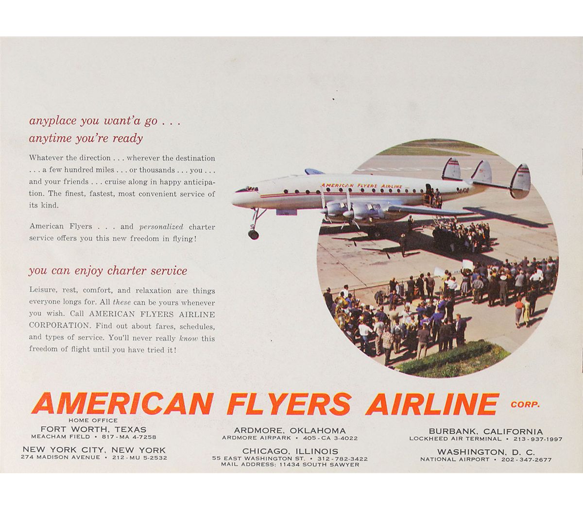 American Flyers Airline Corp. booklet depicting a plane in flight, 11 x 8.25, signed on the front cover in blue ballpoint by John Lennon, Paul McCartney, George Harrison, and Ringo Starr, with an inscription added in an unknown hand, “Best to Marsha.” In fine condition. The Beatles chartered American Flyers for their both their first full US tour in 1964 and their return in 1965, flying from city to city as they spread Beatlemania from the shores of Great Britain to the heartland of America.