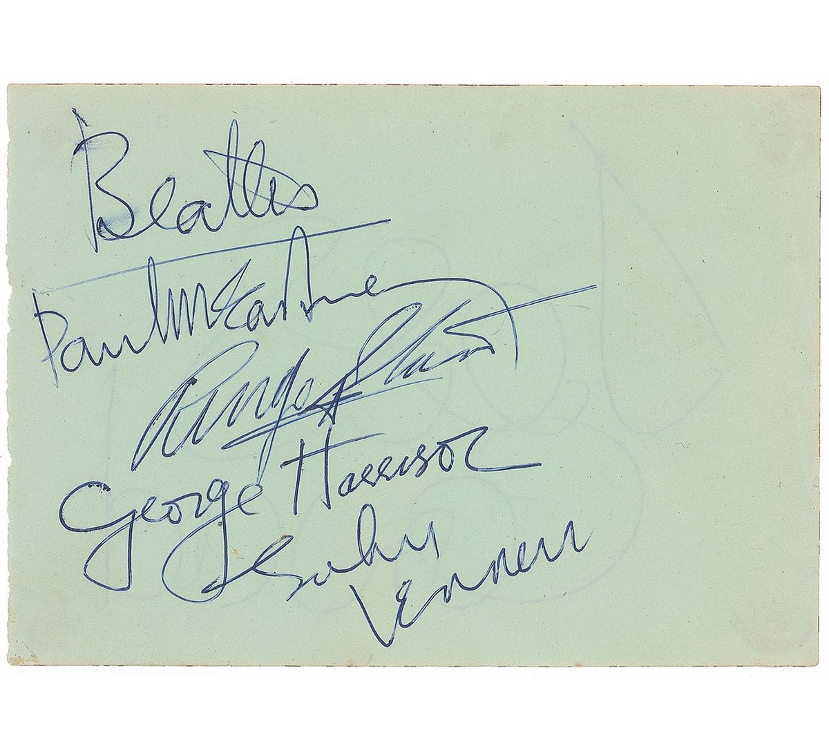 Magnificent set of vintage ballpoint signatures, “Beatles, Paul McCartney,” “Ringo Starr,” “George Harrison,” and “John Lennon,” on a light green 5.25 x 3.75 album page. Signatures were obtained on August 19, 1963, at the Imperial Hotel in Torquay, the day after the group’s performance at the Princess Theatre. Accompanied by a copy of a letter of provenance from the original recipient which reads, in part: “In 1963, when I was fourteen, the Beatles came to my hometown, Torquay, and performed at the Princess Theatre on a Sunday night in August. They were top of the bill of the pop shows that evening, one around 6 and other about 8.30…I remember that we all screamed like mad throughout their performance and I shall never forget the sense of disbelief of the following day, basking in the reflected joy of having seen them for real.…Though we frequently went down to the Princess Theatre on the Sunday afternoon to greet performers as they turned up, the Beatles required a bit more effort and we got their autographs at the Imperial Hotel (then ‘Torquay’s only 5-star hotel’) where my school friend’s father was a doorman with access to them.” In fine condition, with a trivial brush to the “B” in “Beatles.” Accompanied by a certificate of authenticity from Tracks, as well as a photocopy of a newspaper report of the band’s appearance in Torquay. The band played their only concert ever in the seaside town of Torquay on August 18, 1963, with these signatures acquired from the inside of their tightly-sealed hotel.