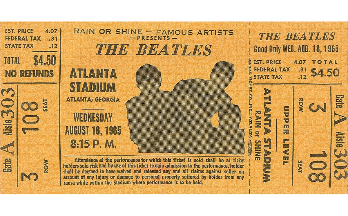 Complete unused concert ticket for the Beatles performance at Atlanta Stadium on August 10, 1965, 5 x 2.5, featuring an image of the ‘Fab Four’ in their famous collarless suits. The mustard-colored ticket granted admission to the upper level of the stadium. A fold at the stub and ballpoint notation to reverse, otherwise fine condition. The Atlanta show received praise for its terrific energy and excellent audio system—screaming fans at other venues often stifled the band’s sound. Full tickets for this concert are quite scarce as the Beatles sold out the stadium, most tickets being reduced to stubs upon admission.