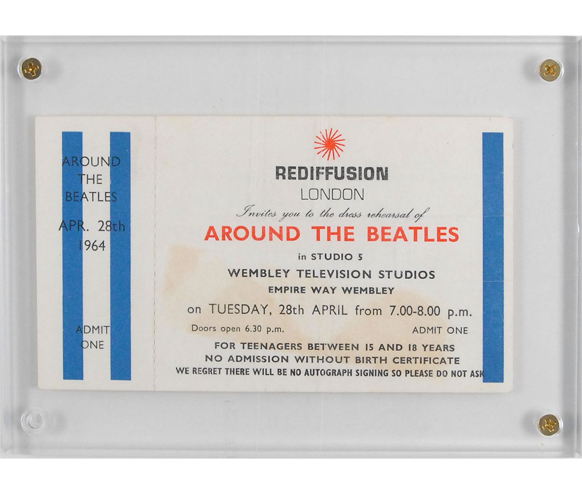 Original ticket from the filming of the Beatles TV special Around the Beatles, 4.25 x 3.25, which took place on April 28, 1964, in Studio 5 of the Wembley Television Studios. At the bottom, ticket states, “For teenagers between 15 and 18 years. No admission without birth certificate. We regret there will be no autograph signing so please do not ask.” Accompanied by a color copy of the letter which accompanied the ticket to the lucky recipient. Some mild toning to lower portion, otherwise fine condition. Complete and unused dress rehearsal tickets such as this are seldom seen for sale.