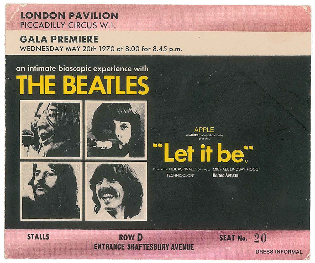 Ticket stub from the ‘Gala Premiere’ of Let It Be held at the London Pavilion on May 20, 1970, 5.5 x 4.5, featuring light pink stripes at the top and bottom and an album cover image. Scattered creases, otherwise fine condition.
