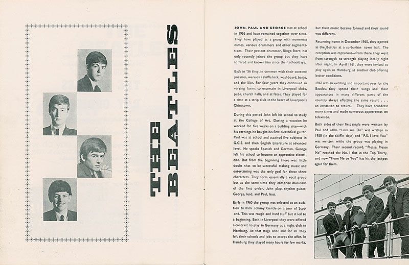 Program from the Beatles’ 1963 tour with Roy Orbison, 8 x 10.25, featuring images and biographies of the performers inside. Supporting acts included Ian Crawford, Gerry and the Pacemakers, and Erkey Grant. A central vertical fold and scattered creases, otherwise fine condition.