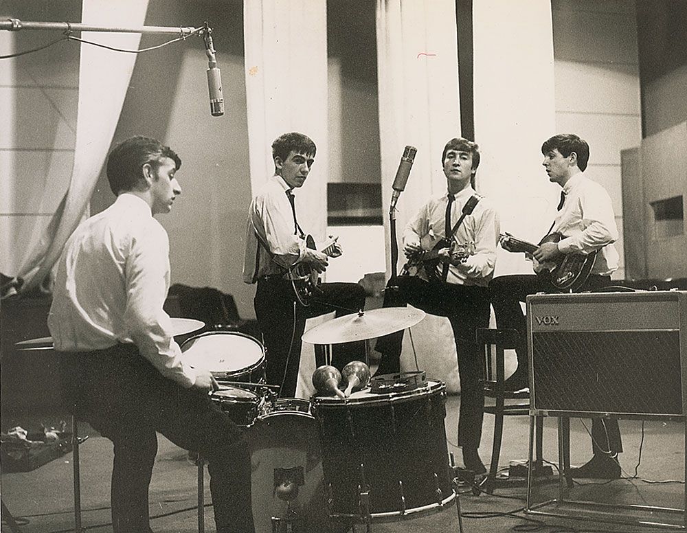 Desirable original 1962 glossy 10.25 x 8 photo by Dezo Hoffman of the Beatles recording their debut single ‘Love Me Do’ at EMI’s Abbey Road Studios on September 4, 1962. Reverse bears Hoffman’s photographer's stamp. In fine condition, with a few surface creases and a tiny red ballpoint mark near the top.