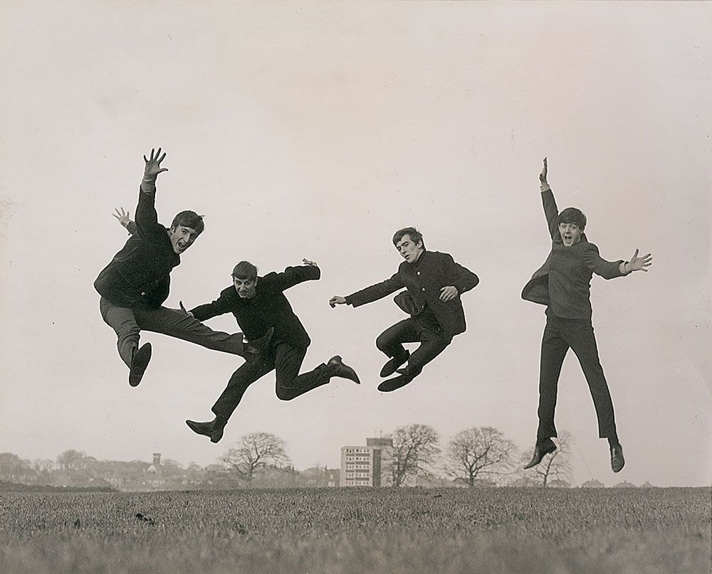 Original glossy 10 x 8 photo taken by Dezo Hoffman in April 1963, showing the Beatles jumping into the air in a pose similar to what would become the famous Twist and Shout sleeve. Reverse bears Hoffman’s photographer’s stamp. In fine condition, with a few surface creases.