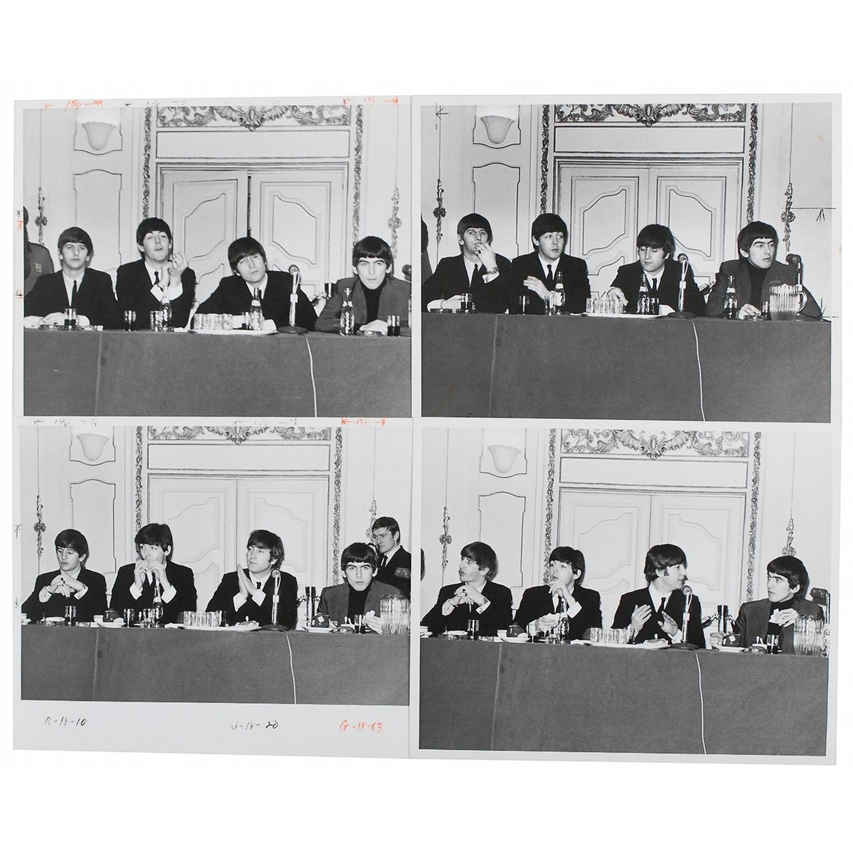 Four original semi-glossy 10 x 8 photos of the Beatles taken during a press conference at the Plaza Hotel, New York on February 10, 1964. Photos are stamped on the reverse by 16 Magazine and bear various production marks and notations. In overall fine condition.