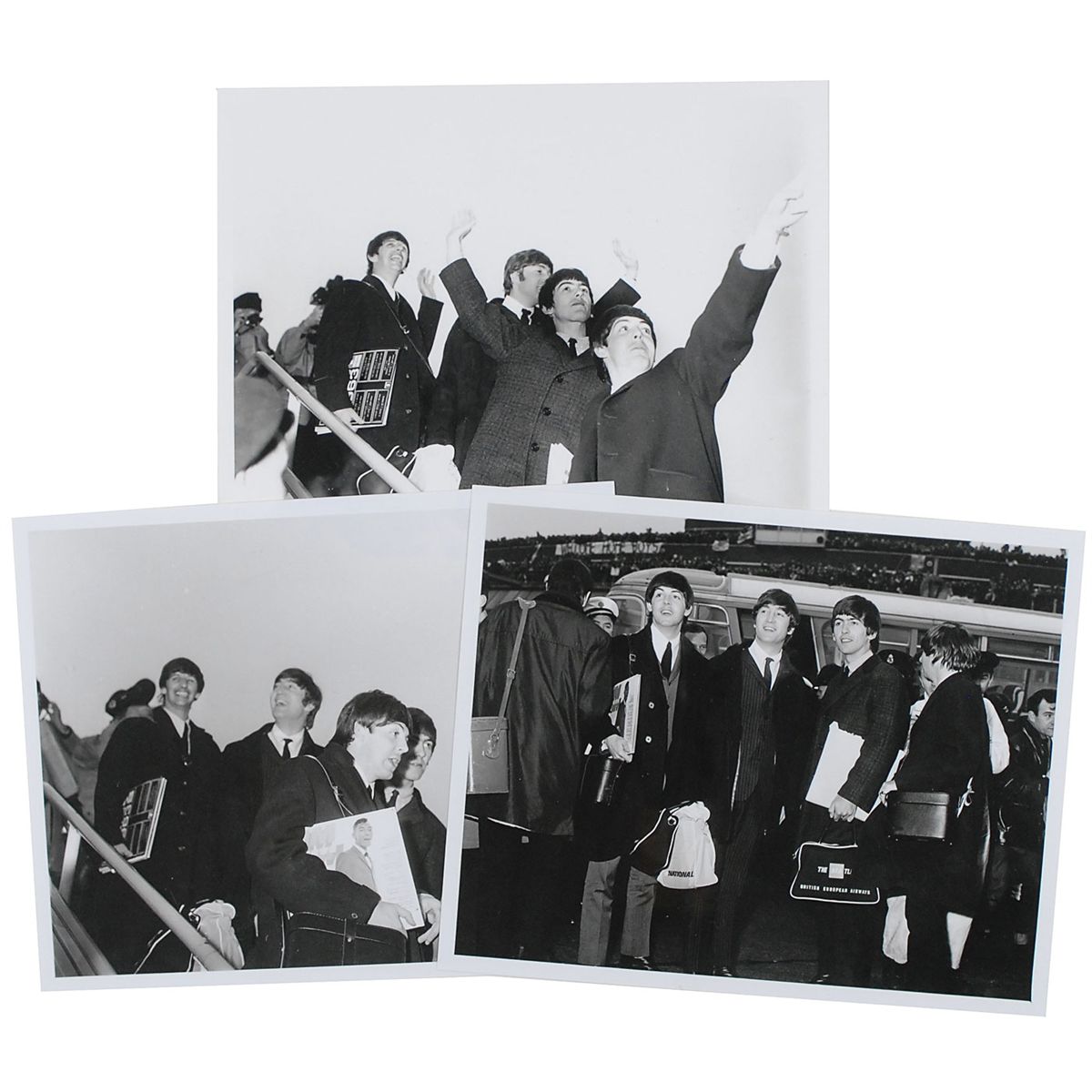Three modern glossy 10 x 8 photos from the original negatives showing the Beatles returning from their triumphant first trip to the United States, originally taken on February 22, 1964. Includes two of the group descending from the plane and one of them in front of the massive crowd that gathered to welcome them back. In overall very fine condition.