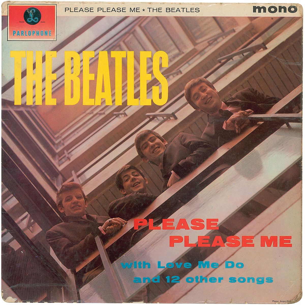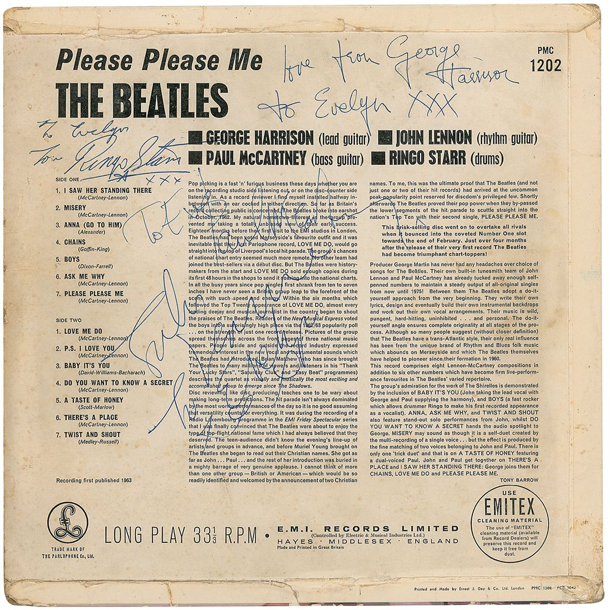 A mono black/gold first pressing of the Beatles’ Please Please Me album signed and inscribed on the back cover in blue ballpoint, “To Eve, Paul McCartney x,” “John Lennon to Evelyn xxx,” “Love from George Harrison to Evelyn xxx,” and “To Evelyn, Love Ringo Starr xxx.” In very good condition, with a partial separation to bottom flip over, scattered creases to both covers, primarily to edges, a couple small edge tears, and some light toning and foxing. All of the signatures are large and quite bold. The record is included. Accompanied by a laminated letter of provenance from the original recipient which reads, in part: “My first meeting with The Beatles was in February 1963 at the Television Studios in Broom Road, Teddington in Middlesex. I was introduced to them by Record Producer Alan Freeman, who I met up with several times over the next few months in the presence of The Beatles and many other Pop stars of the day. Parlophone rush-released the Please Please Me album the following month. I bought my copy at a record store in the North End Road, Fulham in South West London, where I lived—and took it with me to Teddington when I heard The Beatles would next be there—which was in the April of 1963. Again I met up with Alan Freeman who took me through to their dressing room where Paul McCartney was sitting on a divan bed strumming his guitar. John, George and Ringo were busy getting ready for rehearsal. In turn they happily signed the album for me. First to sign it was George Harrison, then Ringo, then Paul—and last but by no means least was John Lennon. Just as the album was passed to him, they were called for those rehearsals—which were for ABC TV’s hugely popular show ‘Thank Your Lucky Stars.’” Also accompanied by a certificate of authenticity from Tracks. This would mark the band’s third appearance on the program, recorded on April 14, 1963, in which they performed just one song, ‘From Me To You.’