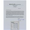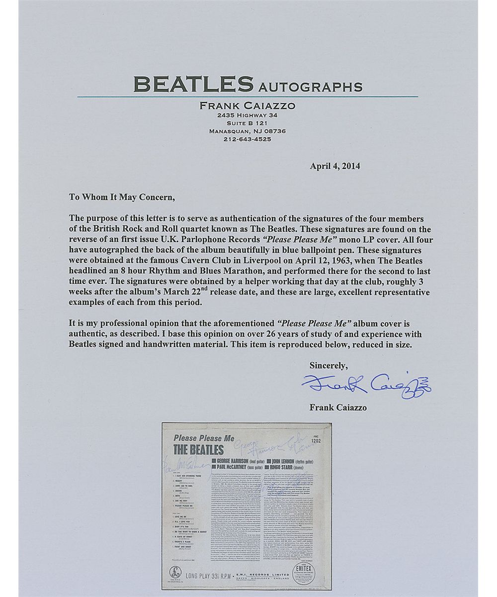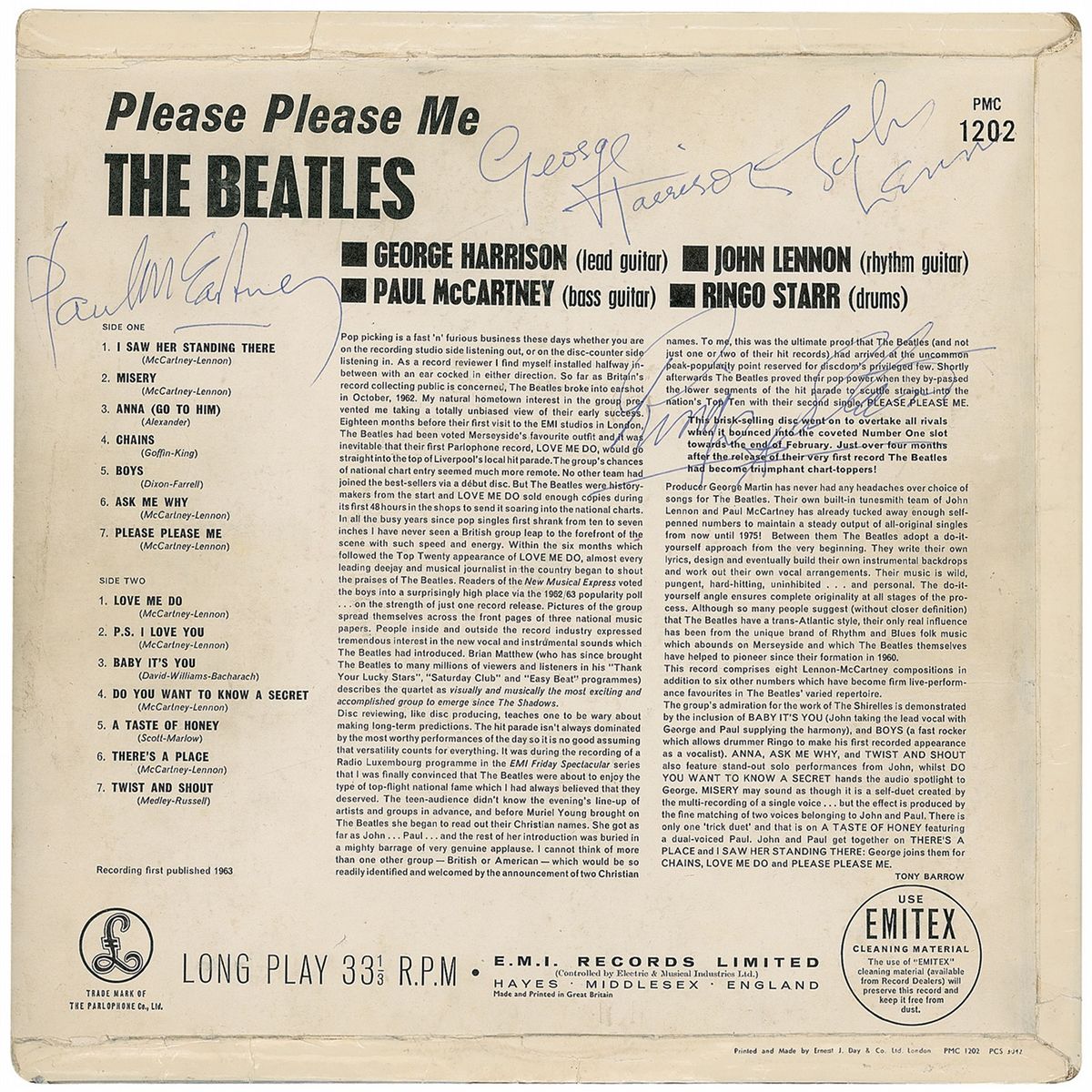 A mono black/gold first pressing of the Beatles’ Please Please Me album signed on the back cover in blue ballpoint, “Paul McCartney,” “John Lennon,” “George Harrison,” and “Ringo Starr.” General wear to corners, creases to edges and front cover, and a bit of light soiling to back cover, otherwise fine condition. All of the signatures are large and quite bold, and the record is included. Accompanied by a letter of authenticity from noted Beatles expert Frank Caiazzo, in part, “These signatures were obtained at the famous Cavern Club in Liverpool on April 12, 1963, when The Beatles headlined an 8 hour Rhythm and Blues Marathon…the signatures were obtained by a helper working that day at the club, roughly 3 weeks after the album’s March 22nd release date, and these are large, excellent representative examples of each from this period.” The employee who obtained the signatures had given Neil Aspinall a hand in moving equipment into the club for their show; after bringing the band refreshments at Aspinall’s request—making tea for Ringo and bringing Coca-Colas for McCartney, Lennon, and Harrison—the young man was too shy to ask the musicians for their autographs, so Aspinall asked them to sign the album for him. Each signed, with McCartney signing last before handing it back. This show marked the Beatles’ second-to-last performance at the Cavern Club—four months later, on August 3rd, the band would play their 292nd and final show there, saying farewell to the venue that had given them their start.