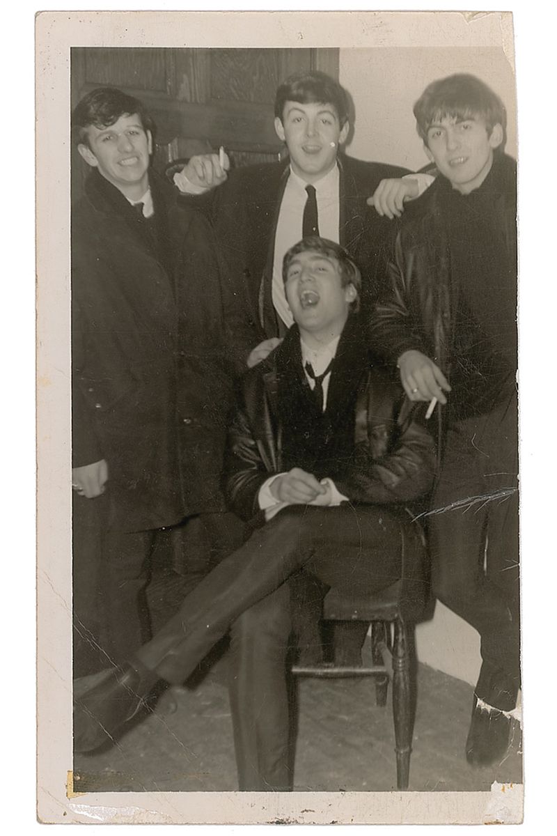 Vintage ballpoint signatures, “John Lennon,” “Paul McCartney,” “George Harrison, xxx, The Beatles,” and “Ringo Starr, xxx,” on the reverse of an unrelated 3.5 x 5.5 photo of a couple. Also signed by five unidentified others. Mild scattered creases and soiling, otherwise fine condition. Accompanied by a letter of provenance from the original recipient, in part: “I got enclosed autographs in 1963 in the Museum Hall, Bridge of Allan, [Scotland, January 5, 1963]. I…used to go along every Saturday night. I saw Eden Kane, Screaming Lord Sutch, Drumbeats…and this new group called the Beatles. They were brilliant, after the show I went back stage to get their autographs, this might be too much information, but I sat on John Lennon’s knee and he gave me a cigarette (I couldn’t tell me mom, as she didn’t know I smoked).” Also includes an original candid snapshot of the group backstage at the venue and a certificate of authenticity from Tracks. A very early set of signatures from the penultimate date of the Beatles’ first tour of Scotland, enhanced by a detailed backstory and unique candid photo.