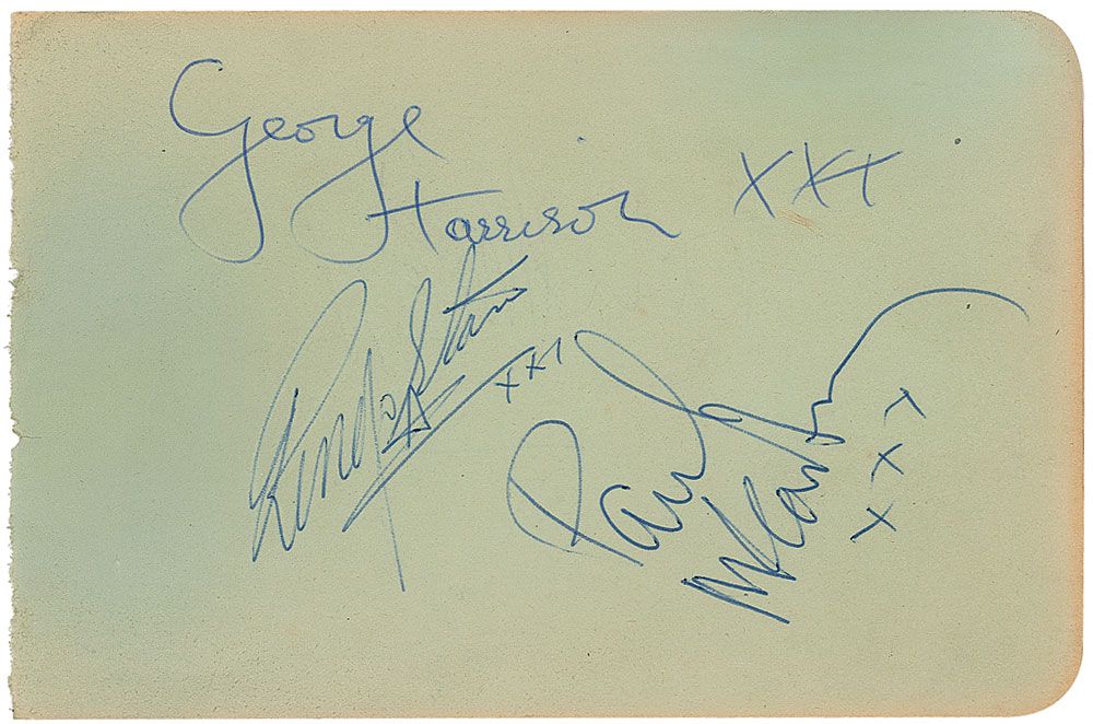 Unusual set of vintage ballpoint signatures on two 6 x 4 album pages: one prominently signed on the front by John Lennon and signed twice on the reverse by George Harrison; and one signed on the front by Paul McCartney, George Harrison, and Ringo Starr, and signed again on the reverse by McCartney. The page signed by Paul, George, and Ringo has had a stain professionally removed, otherwise overall fine condition. These autographs were obtained at the Regal Cinema, Cambridge, England, on November 26, 1963, and are accompanied by a certificate of authenticity from Tracks. An appealing set of large, uninscribed Beatles autographs, signed just four days after the release of their second album, With the Beatles.