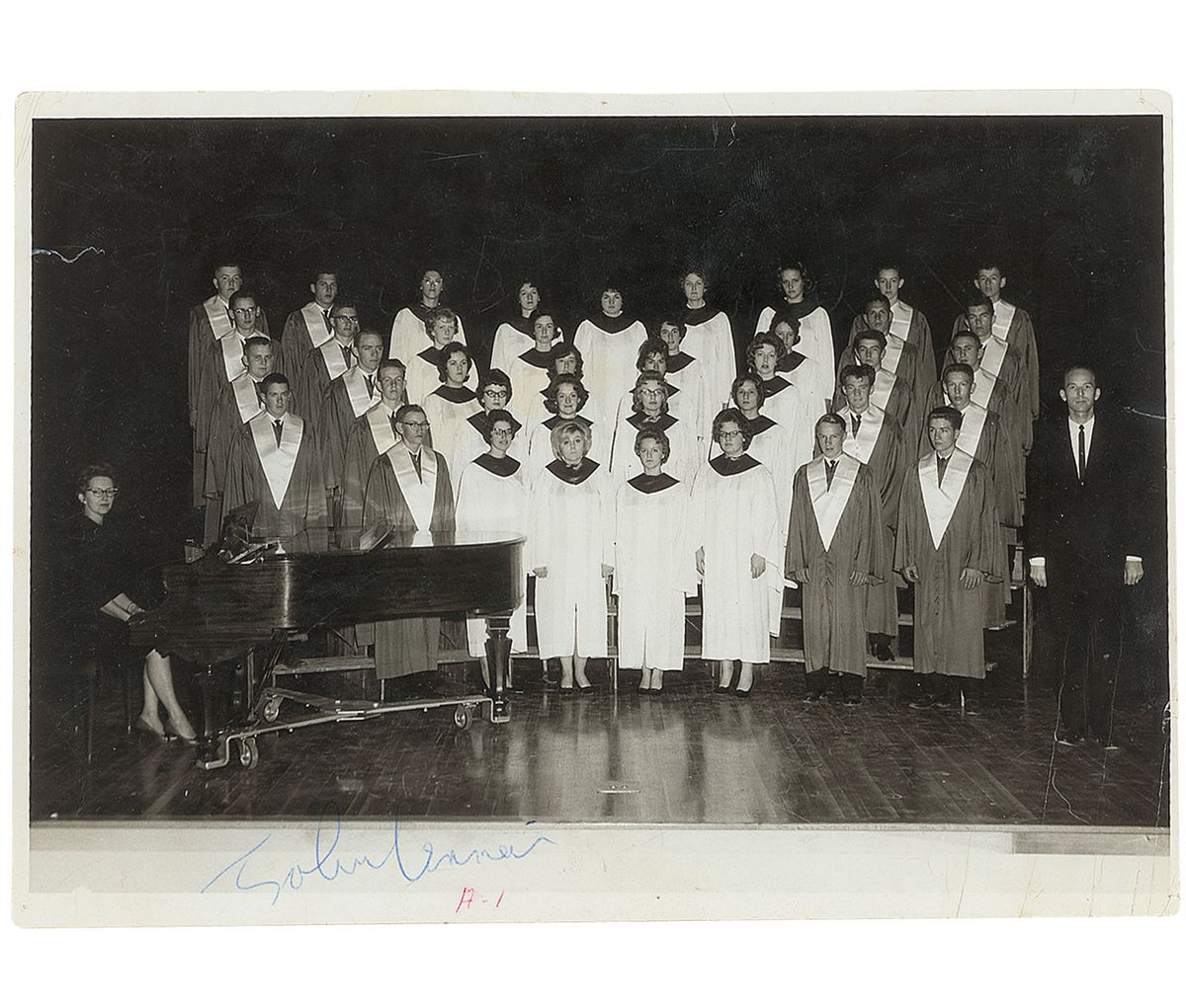 Unusual vintage 1964 glossy 9.5 x 7 photo of the Alton High School choir in Alton, Missouri, prominently signed on the reverse in blue ballpoint by John Lennon, Paul McCartney, George Harrison, Ringo Starr, and Brian Epstein, and also signed once on the front by Lennon. In very good condition, with scattered creases (a noticeable crease passing through the first letter of Epstein’s signature), some light staining, some mounting remnants to the upper right corner, and a few ink and pencil notations to reverse (one pencil line passing through the top of Epstein’s signature).