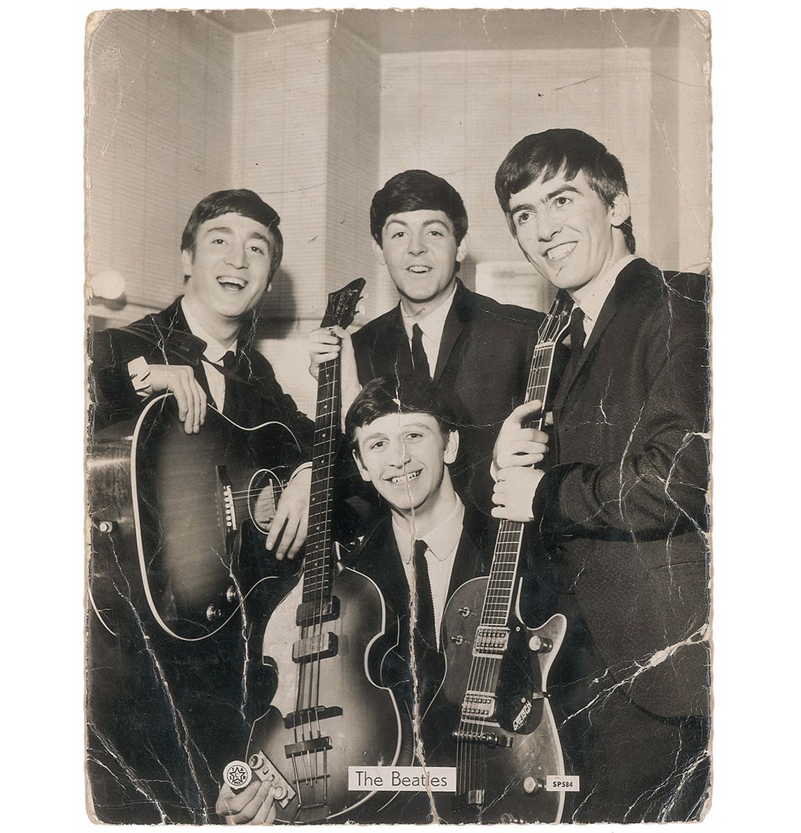 Vintage glossy 6 x 7.5 group photo of the Fab Four posing with three guitars, issued by Star Pictures in England as “SP584” in 1963, signed on the reverse in blue ballpoint, “Love from the Beatles, Ringo Starr xx,” “Paul McCartney xxx,” and “George Harrison.” A central vertical tear passing through a single letter of Harrison’s signature, scattered light toning, noticeable creases to reverse, heavier to the image side, otherwise very good condition.