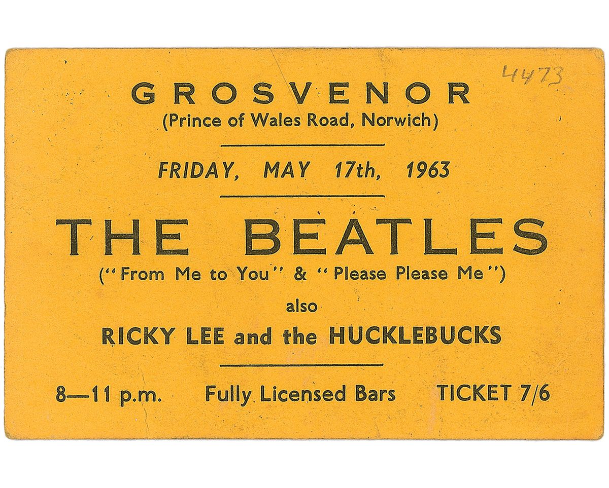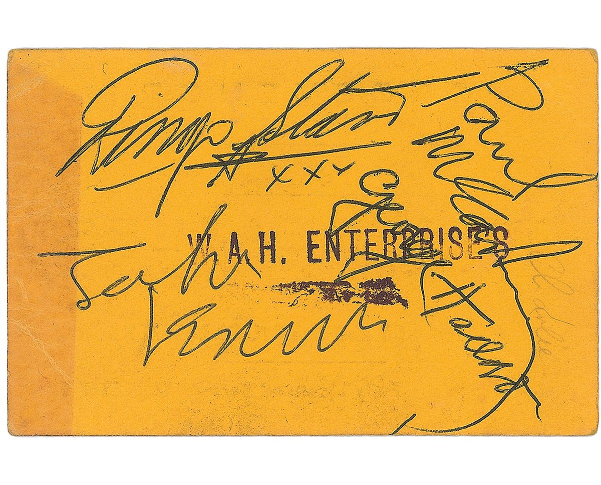 Ticket to the Beatles concert at the Grosvenor in Norwich, held on May 17, 1963, 3.5 x 2.25, signed on the reverse in blue ballpoint, “Paul McCartney,” “John Lennon,” “Ringo Starr xxx,” and “George Harrison.” In fine condition, with Paul’s and George’s signatures passing across a small stamp, expected handling wear, and some light toning along left edge. This was the band’s final stop on their 1963 spring tour, where they played two 20-minute sets in front of a capacity crowd of 1700 adoring fans. Ironically, the band had been turned down by one promoter due to the fact they only had one hit at the time. By May 17, the band had the number one single and album in the country.