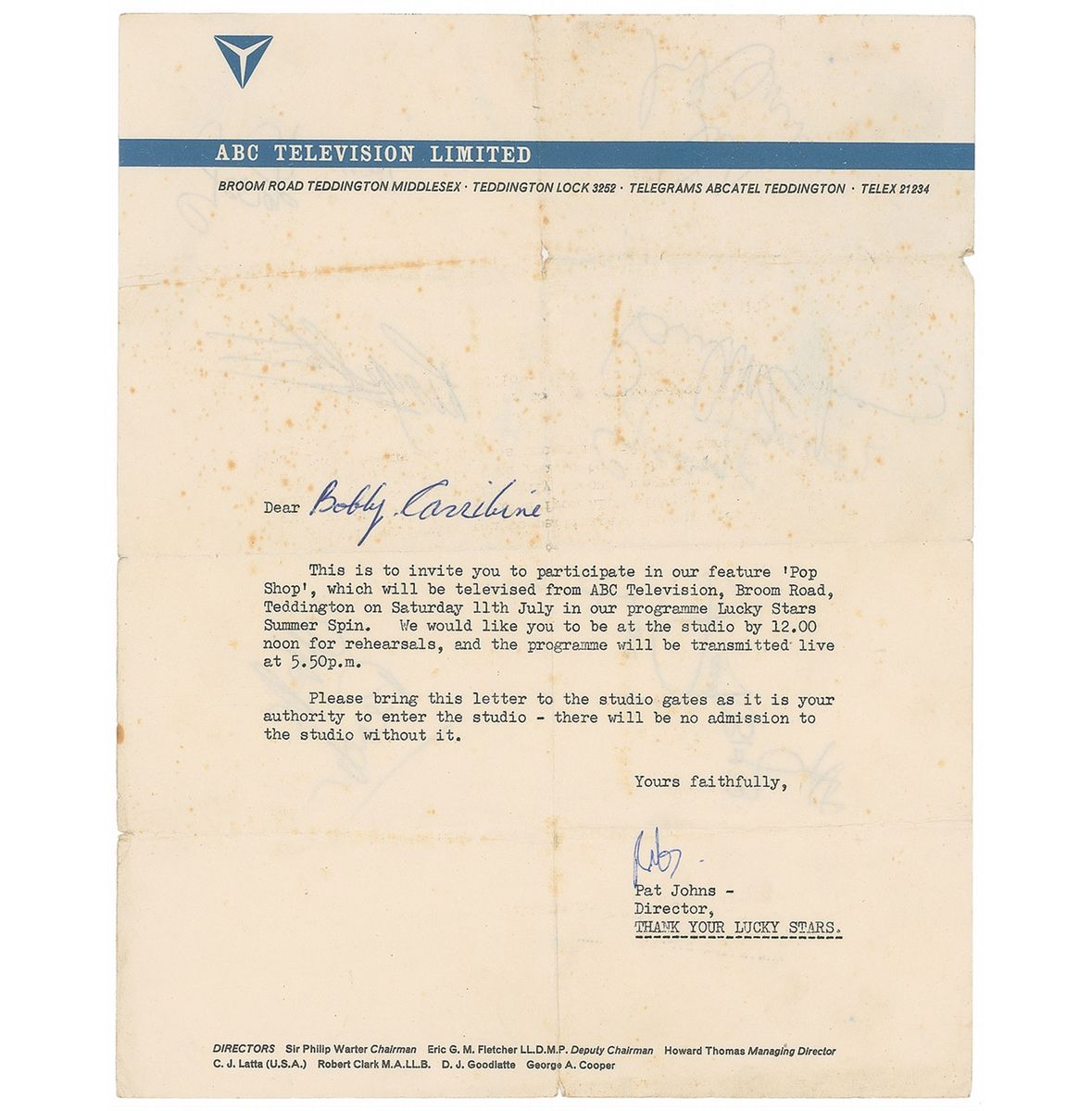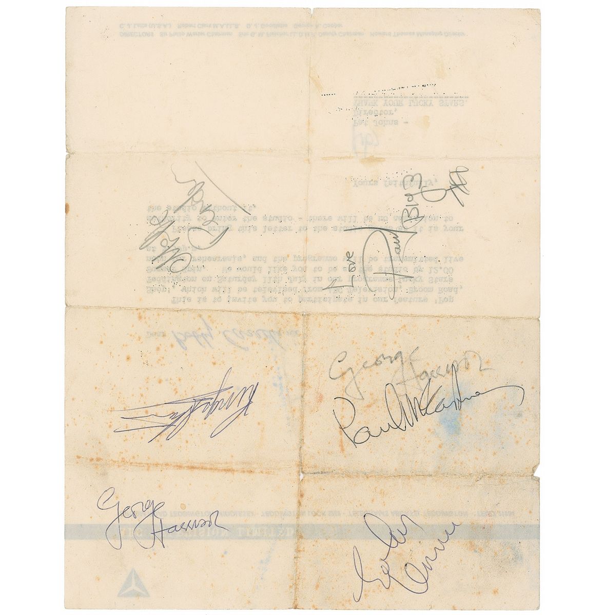 An incredibly rare invitation extended to a young woman to appear on the July 11, 1964, ABC Television show Lucky Stars Summer Spin, one page, 7.75 x 10. Typed on ABC Television Limited letterhead, inviting the woman to the studio for noon, with a live broadcast scheduled at 5:50 pm. Signed on the reverse in blue ballpoint by John Lennon, George Harrison, and Ringo Starr, and in black ballpoint by Paul McCartney. Harrison has added a second signature in black felt tip. Reverse is also signed in pencil by Mike Pender of the Searchers and Paul of the Big 3. Intersecting folds, none affecting any of the Beatles’s signatures, scattered foxing over three of the signatures, a few pin-size areas of paper loss along folds, light wrinkling and handling wear, and Harrison’s felt tip signature fairly light, but still legible, otherwise very good condition. Accompanied by a letter of provenance from the invitation’s recipient and a certificate of authenticity from Tracks.