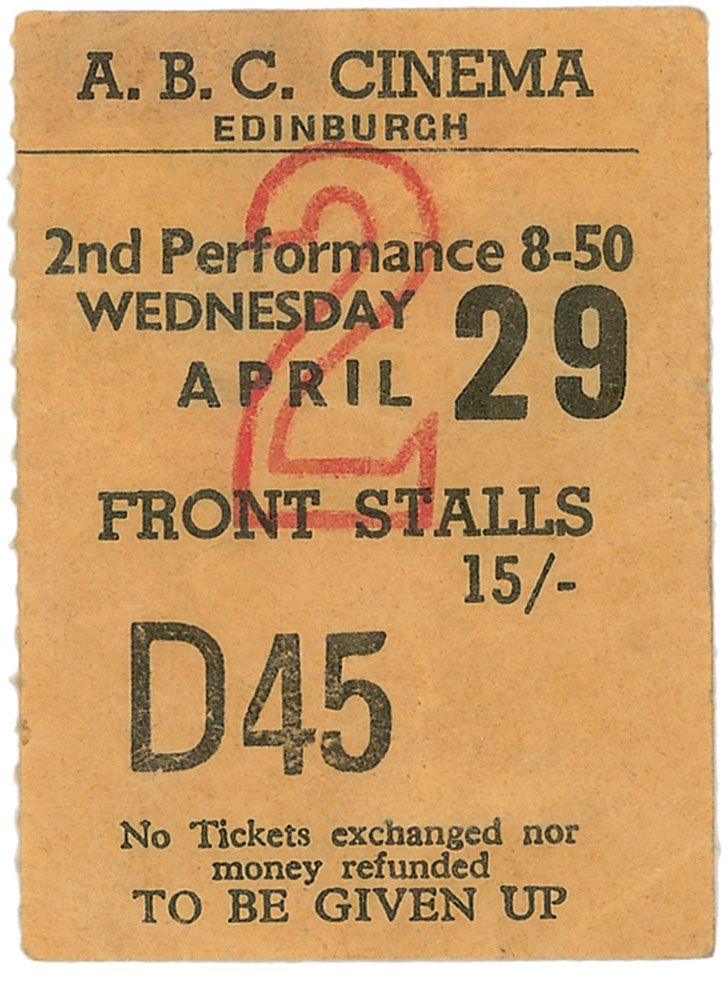 Original concert ticket to the Beatles April 29, 1964, show at the A. B. C. Cinema in Edinburgh, Scotland. Ticket measures 1.75 x 2.25, and is for the second show of the evening, for the “front stalls” seating area. In fine condition, with a bit of light wrinkling.