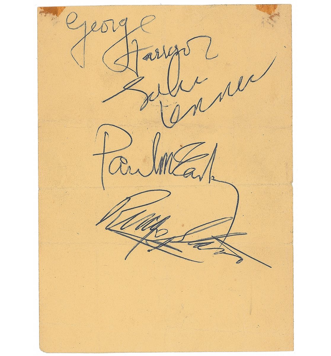 Vintage ballpoint signatures, “George Harrison,” “John Lennon,” “Paul McCartney,” and “Ringo Starr,” on a light yellow 3.75 x 5.25 sheet. Signatures date from mid-1963 to early 1964. In fine condition, with intersecting folds lightly passing through portions of signatures and two small spots of toning along top edge.