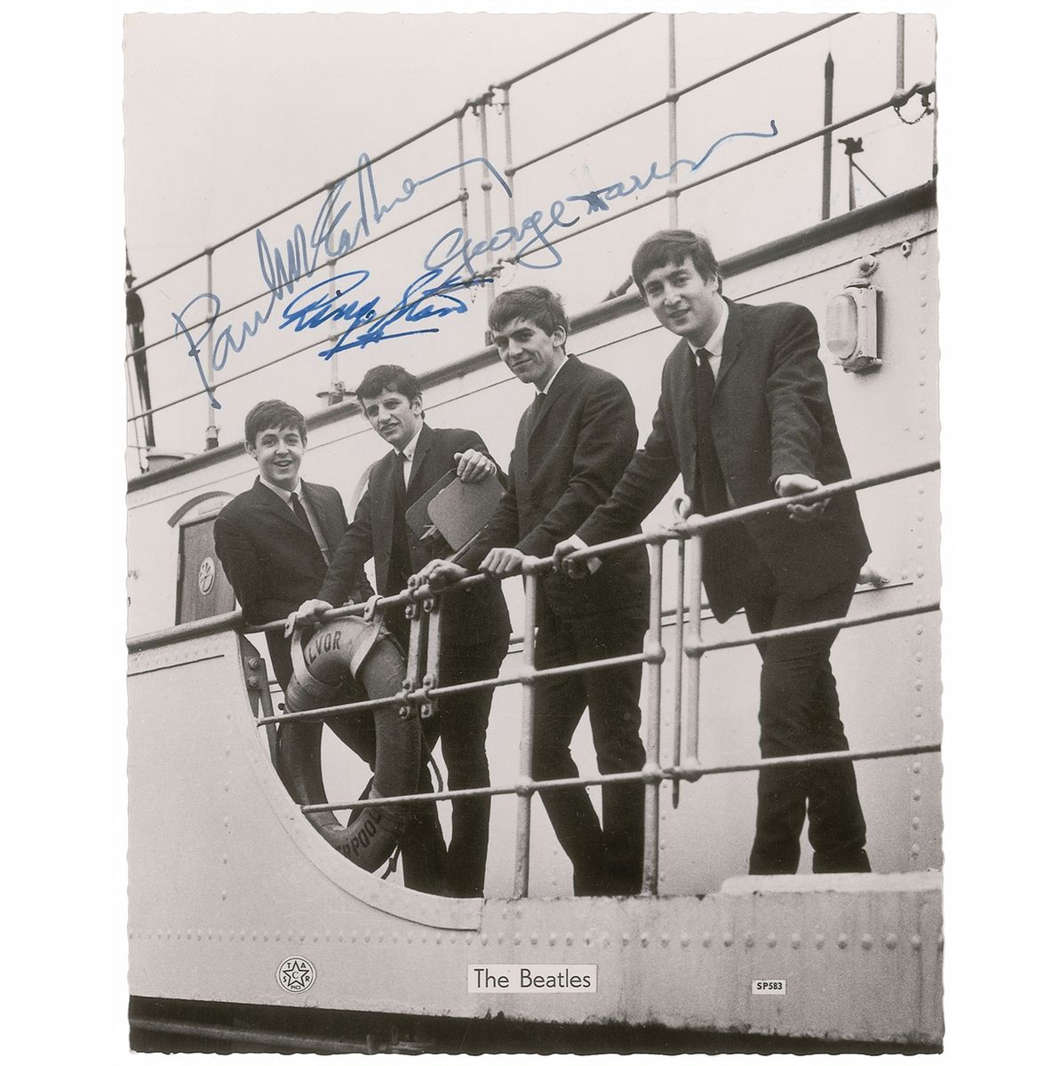Vintage glossy 6 x 7.5 deckle-edge photo of the band posing along the railing of a ship, issued by Star Pictures in England as “SP583” in 1963, signed in fountain pen, “Paul McCartney,” “George Harrison,” and “Ringo Starr.” In fine condition, with a faint impression of a Lennon secretarial signature which has been neatly removed, and is visible only at an angle. Signatures were obtained backstage at the Odeon Cinema, Llandudno, Wales between August 12–17, 1963. The band played two shows a night for six consecutive days at the Odeon in the midst of their lengthy summer tour.