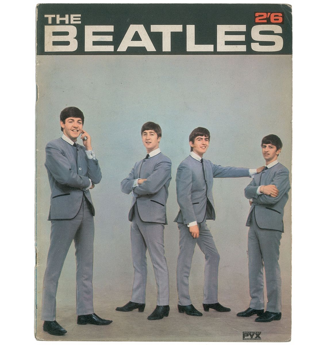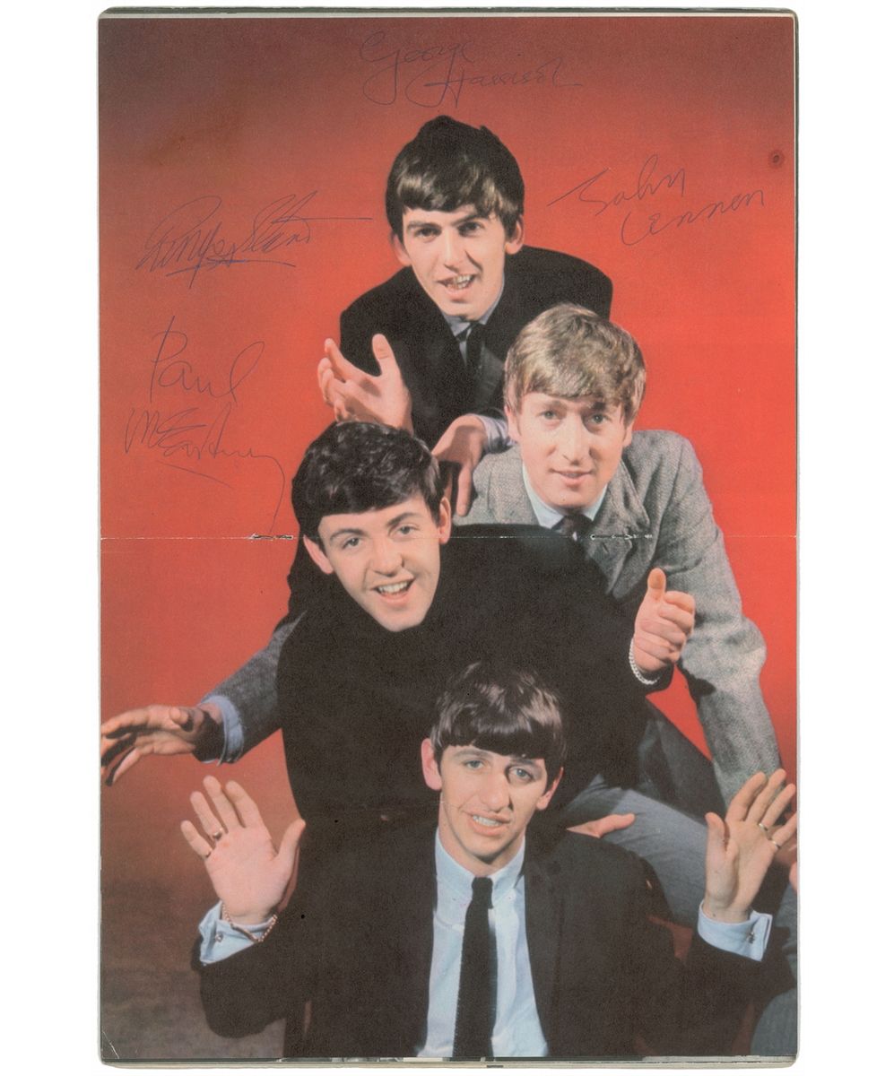 Supremely rare vintage UK Beatles magazine from 1963, published by PYX, 7.25 x 9.5, 28 pages, featuring a classic color Dezo Hoffman photograph of the band in their matching gray collarless suits on the cover, beautifully signed on the color centerfold photo in blue ballpoint, “Paul McCartney,” “John Lennon,” “George Harrison,” and “Ringo Starr.” With the magazine open, the signed image measures 9.5 x 14.5. In fine condition, with a few creases to the centerfold pages. Autographs were obtained in person by a young female fan at the Princess Theater, Torquay, Devon, England, on August, 18, 1963. Although PYX magazines signed on the cover occasionally surface, this is the first time we have encountered this attractive fully signed centerfold.