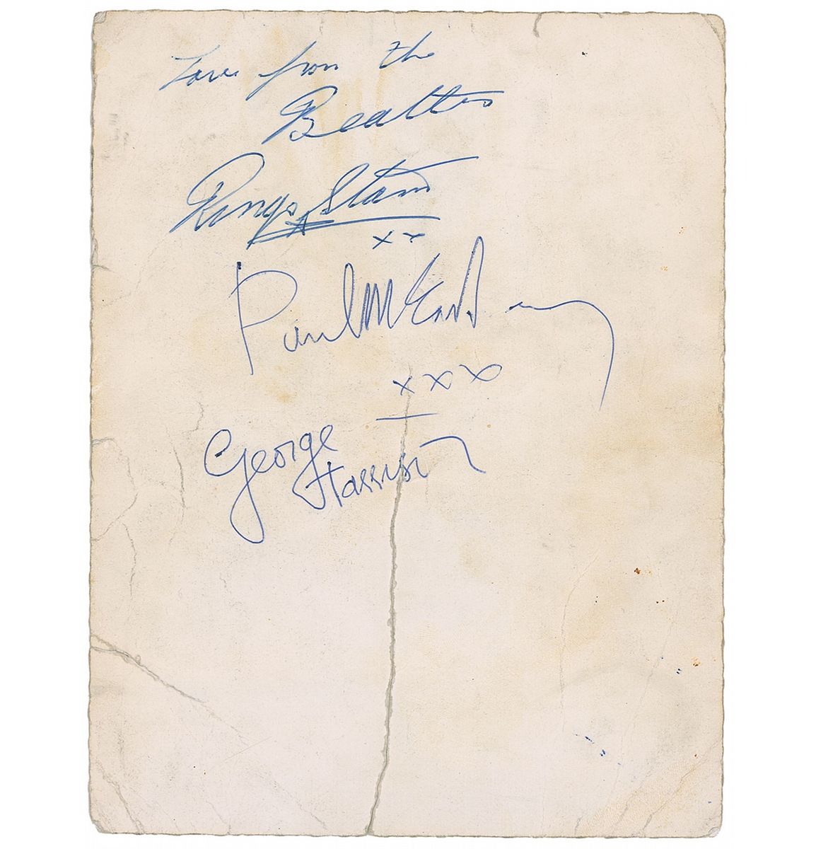 Vintage glossy 6 x 7.5 group photo of the Fab Four posing with three guitars, issued by Star Pictures in England as “SP584” in 1963, signed on the reverse in blue ballpoint, “Love from the Beatles, Ringo Starr xx,” “Paul McCartney xxx,” and “George Harrison.” A central vertical tear passing through a single letter of Harrison’s signature, scattered light toning, noticeable creases to reverse, heavier to the image side, otherwise very good condition.