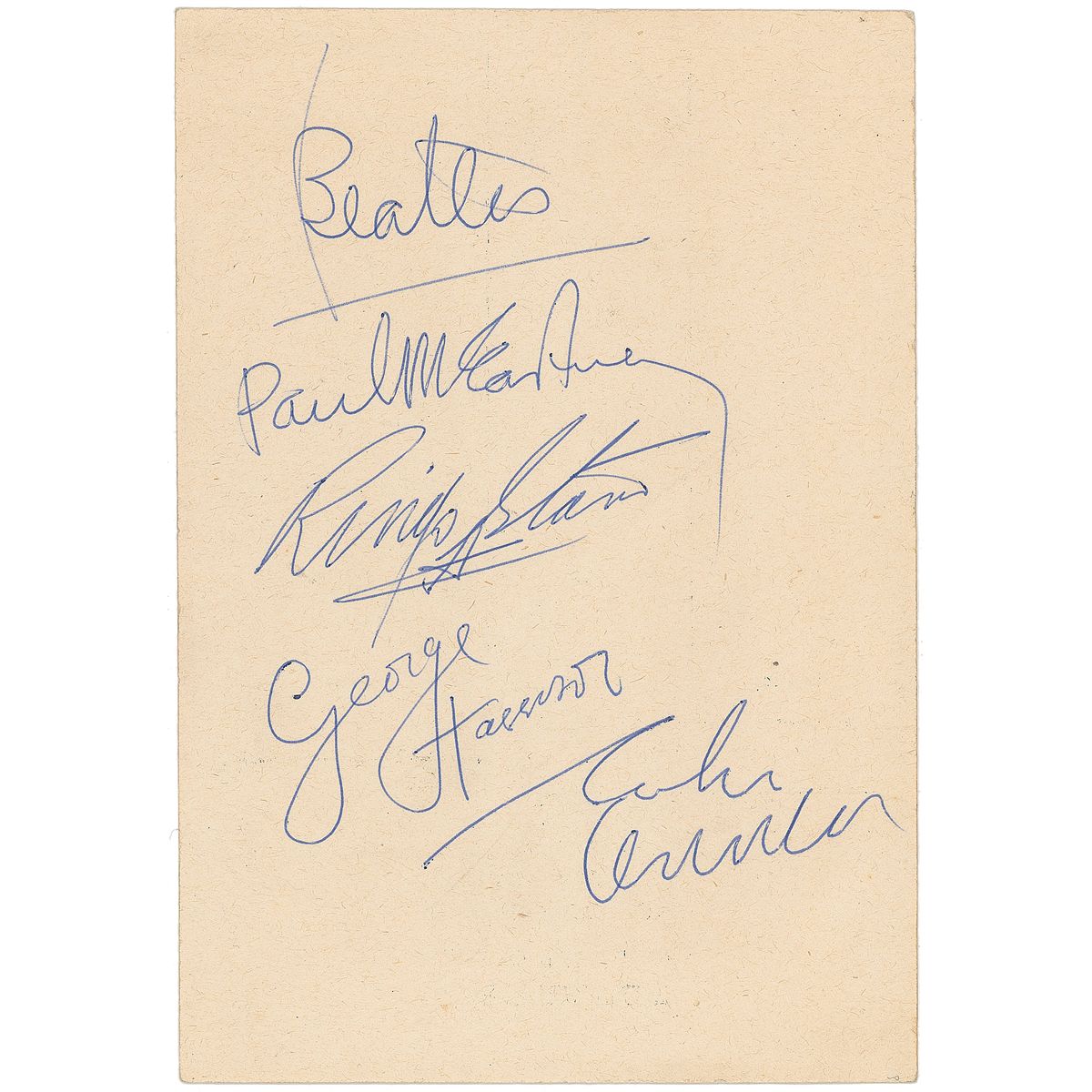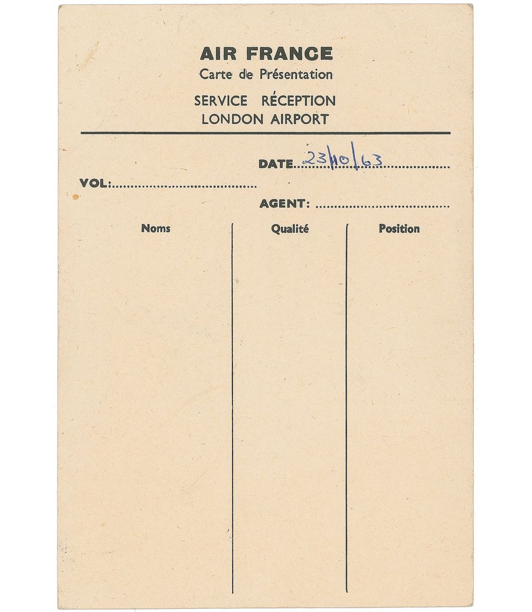 An Air France London Airport service card, 4 x 6, signed on the reverse in blue ballpoint, “Beatles, Paul McCartney,” “Ringo Starr,” “George Harrison,” and “John Lennon.” Front of the card is dated October 23, 1963, in another hand. In fine condition, with a few scattered light creases. All the signatures were obtained at London Airport on October 23, 1963, when the band was flying out to Stockholm, Sweden, for their first ever European tour. Earlier in the day the group was at EMI Studios, Abbey Road, London, and had made the final input into their second album With The Beatles, recording the 16th take of ‘I Wanna Be Your Man’ and then watching as George Martin and Norman Smith mixed ‘Little Child’ and ‘Hold Me Tight’ into mono.
