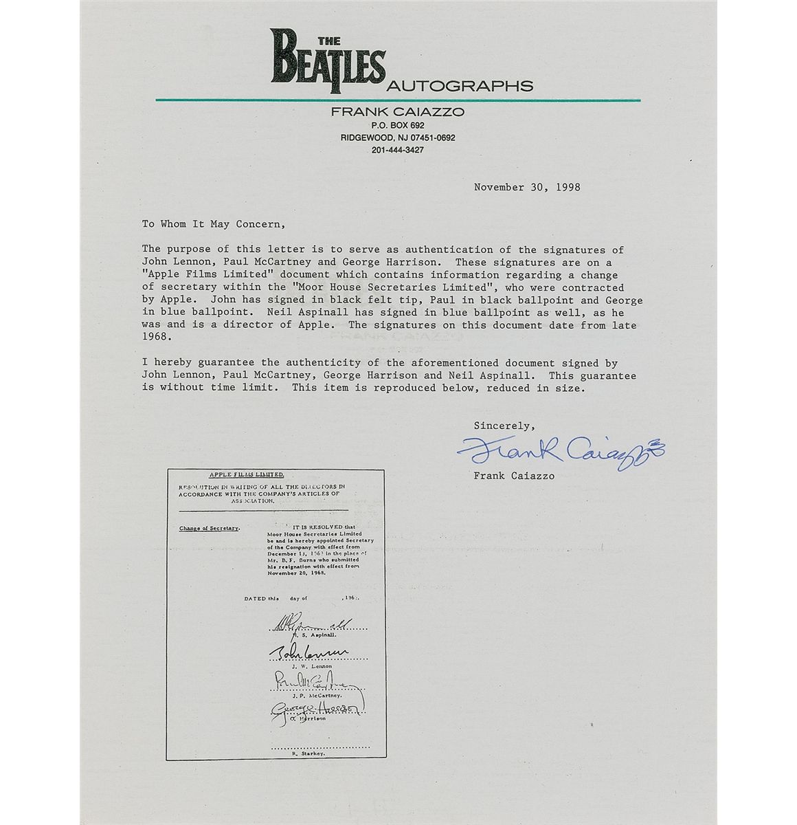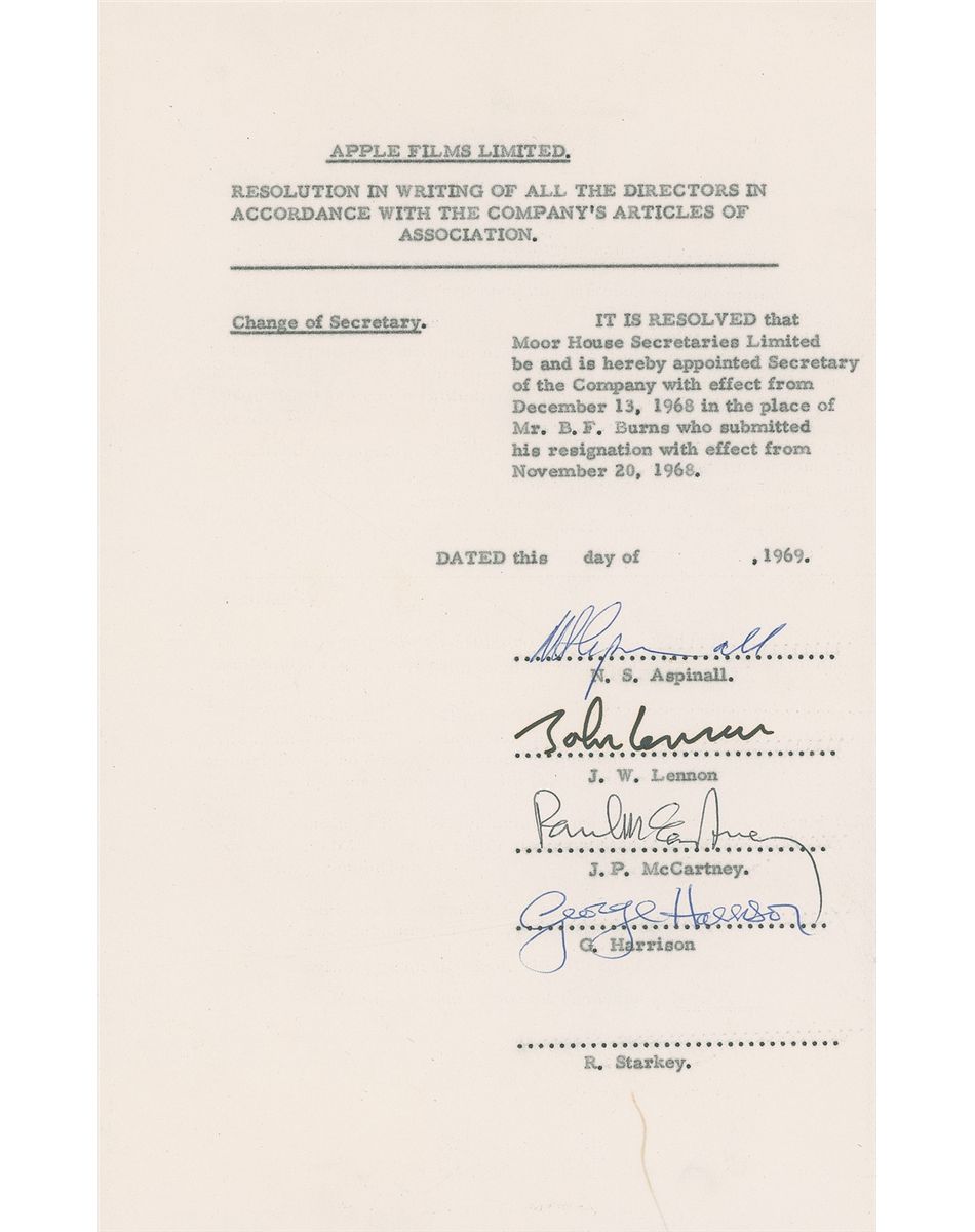 Rare DS, one page, 7 x 11, 1969. Apple Films Limited resolution regarding a change to the company’s secretary. Document reads, “It is resolved that Moor House Secretaries Limited be and is hereby appointed Secretary of the Company with effect from December 13, 1968 in the place of Mr. B. F. Burns who submitted his resignation with effect from November 20, 1968.” Signed at the conclusion in black felt tip by John Lennon, in black ballpoint by Paul McCartney, and in blue ballpoint by George Harrison. Document is also signed in blue ballpoint by Apple managing director Neil Aspinall, with Lennon adding a short vertical line on the reverse apparently to test his one before signing. Ringo Starr’s line is blank, as his signature was not necessarily required, with the majority of the directors already having signed. In fine condition, with slight show-through from Lennon’s test line on reverse. Accompanied by a letter of authenticity from noted Beatles expert Frank Caiazzo. The film-making division of Apple Corps. would release several of the band’s films, including Yellow Submarine and Let It Be. It was during this time in late 1968 that tensions among the band were escalating, causing dissension in the studio during the recording of The White Album. It marked the beginning of the end of the Beatles as a single, unified group. Any official Apple document signed by a majority of the band is exceedingly scarce.