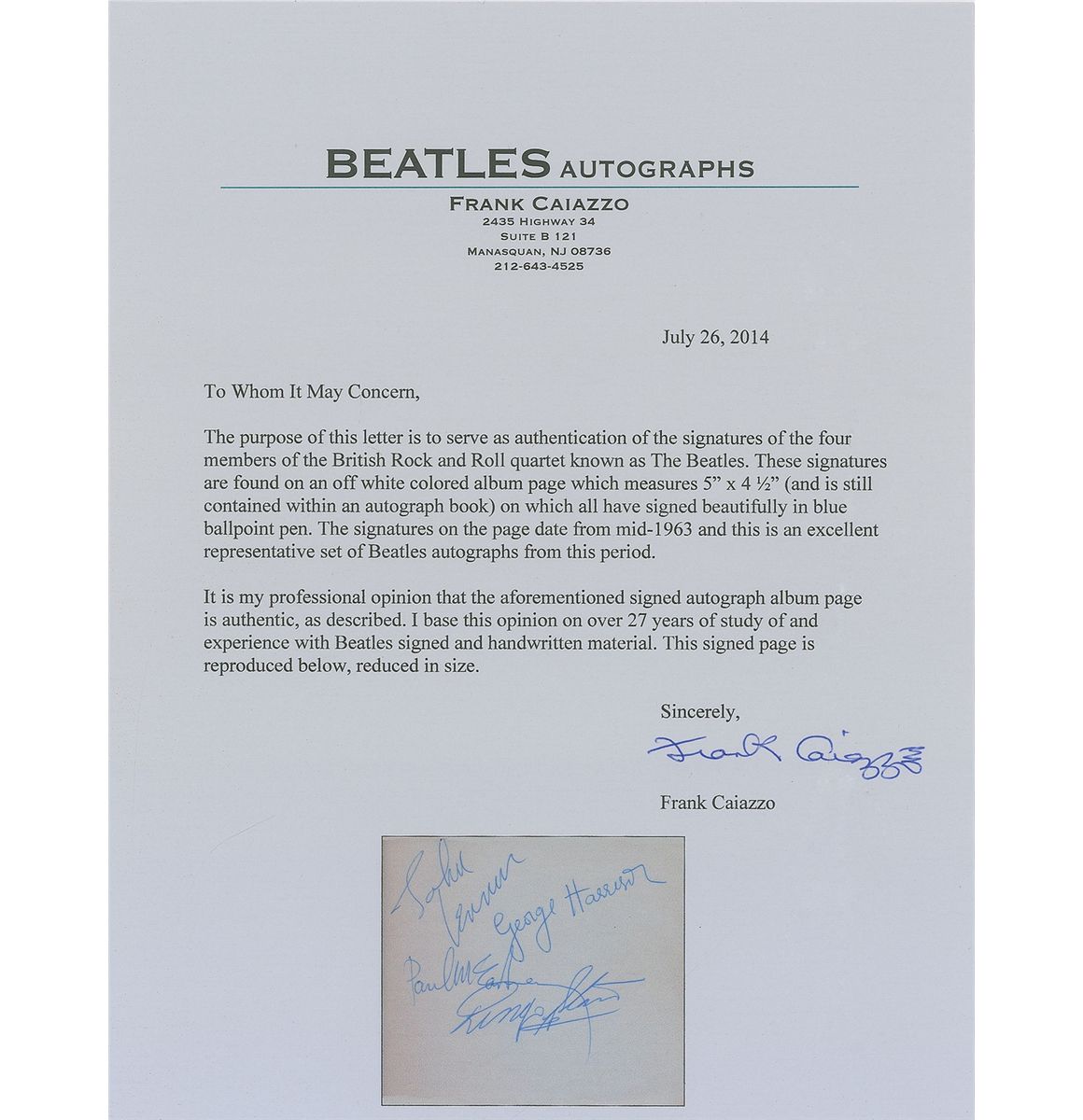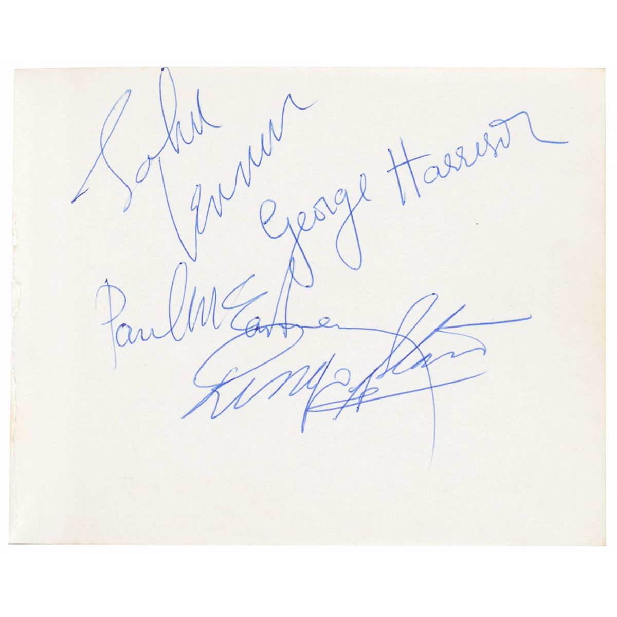 Pristine circa mid-1963 ballpoint signatures of John Lennon, Paul McCartney, George Harrison, and Ringo Starr on an off-white 5.5 x 4.5 album page still contained within its original autograph book; the first page of the album (directly before the signed page) has been removed, and no other autographs are present in the remainder of the pages. In very fine condition. Accompanied by letters of authenticity from Tracks and from noted Beatles expert Frank Caiazzo, who writes, in part: “The signatures on the page date from mid-1963 and this is an excellent representative set of Beatles autographs from this period.” This fully signed album page is undoubtedly one of the finest extant and has every desirable quality—a bright, clean page; bold, uninscribed signatures; and an early date during the period of their wildest international fame.