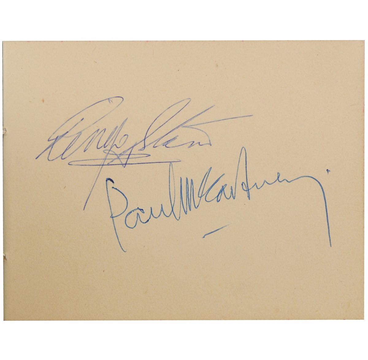 Ideal late-1963 uninscribed bold ballpoint signatures of John Lennon, Paul McCartney, George Harrison, and Ringo Starr on two separate 4.5 x 2.5 album pages still contained within their original autograph book. In fine to very fine condition. Accompanied by a certificate of authenticity from Tracks and a detailed letter from the original recipient, in part: “In 1963 my husband…won a competition held by the Scottish Express newspaper to go and see the ‘Beatles’ perform in concert in the Caird Halll Dundee on the 7th of October 1963 along with another boy and two girls and afterward they went backstage to meet them…Backstage the ‘Beatles’ signed autographs and posed for pictures, Ringo was the chattiest and asked…what they did for entertainment in Dundee…Gordon Reid was the reporter from the Express who was there looking after the competition winners and his autograph is also in the book.” This concert concluded the Beatles’ Autumn 1963 Scotland Mini-Tour, the last of three performances in the country. On the following Sunday, October 13, 1963, the Beatles appeared on the UK’s top variety show, Sunday Night at The London Palladium. Observing the screaming fans inside and outside the venue, the next morning’s Daily Mirror described the mass hysteria in a single word that would soon be adopted into the worldwide cultural lexicon—‘Beatlemania.’