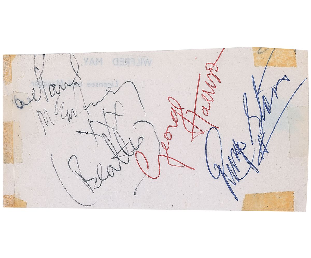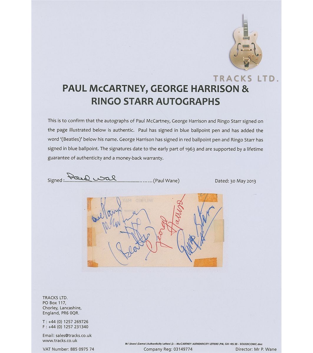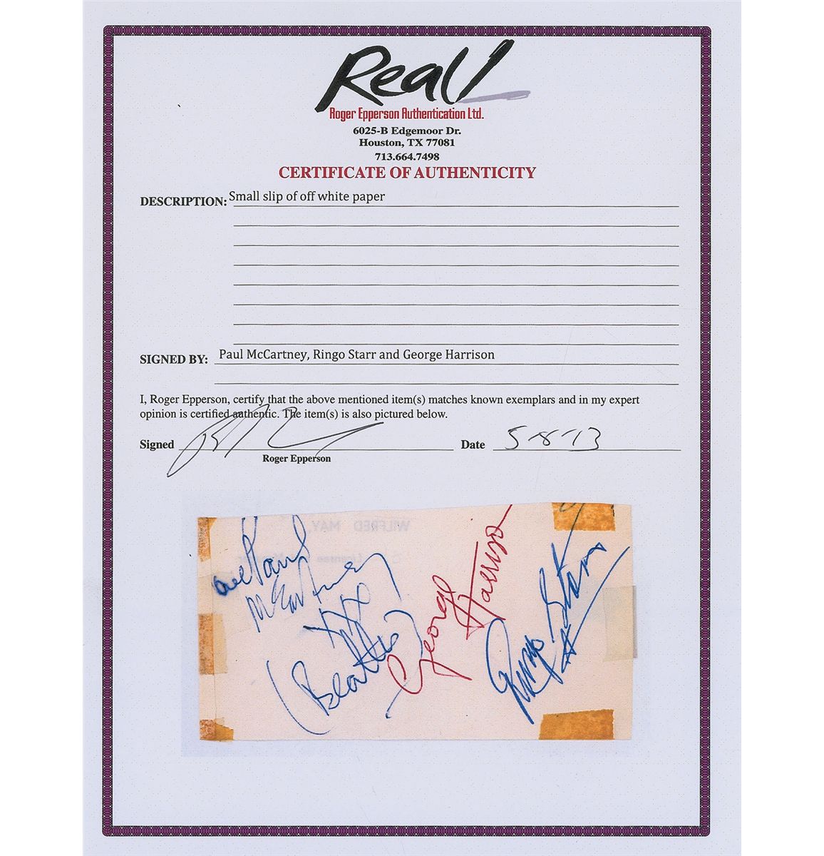 Desirable circa early 1963 ballpoint signatures, “love Paul McCartney, xxx, (Beatles),” “George Harrison,” and “Ringo Starr,” on an off-white 4.25 x 2.25 slip. In very good condition, with toned tape remnants to edges (slightly affecting the McCartney and Starr signatures) and closely cropped edges (affecting the top of McCartney’s signature and trivially affecting the ends of the other two). Accompanied by a full letter of authenticity from Roger Epperson/REAL and certificate of authenticity from Tracks.