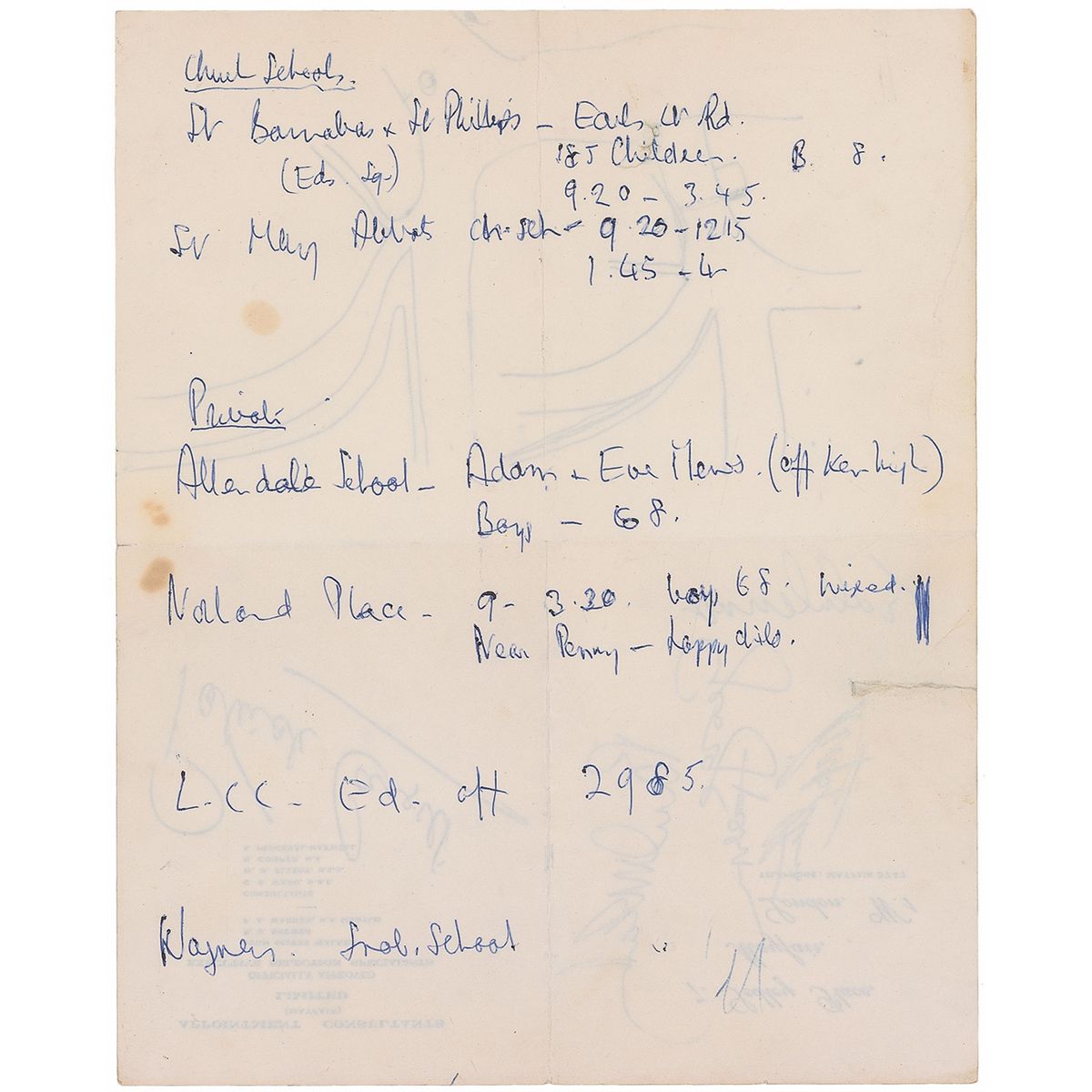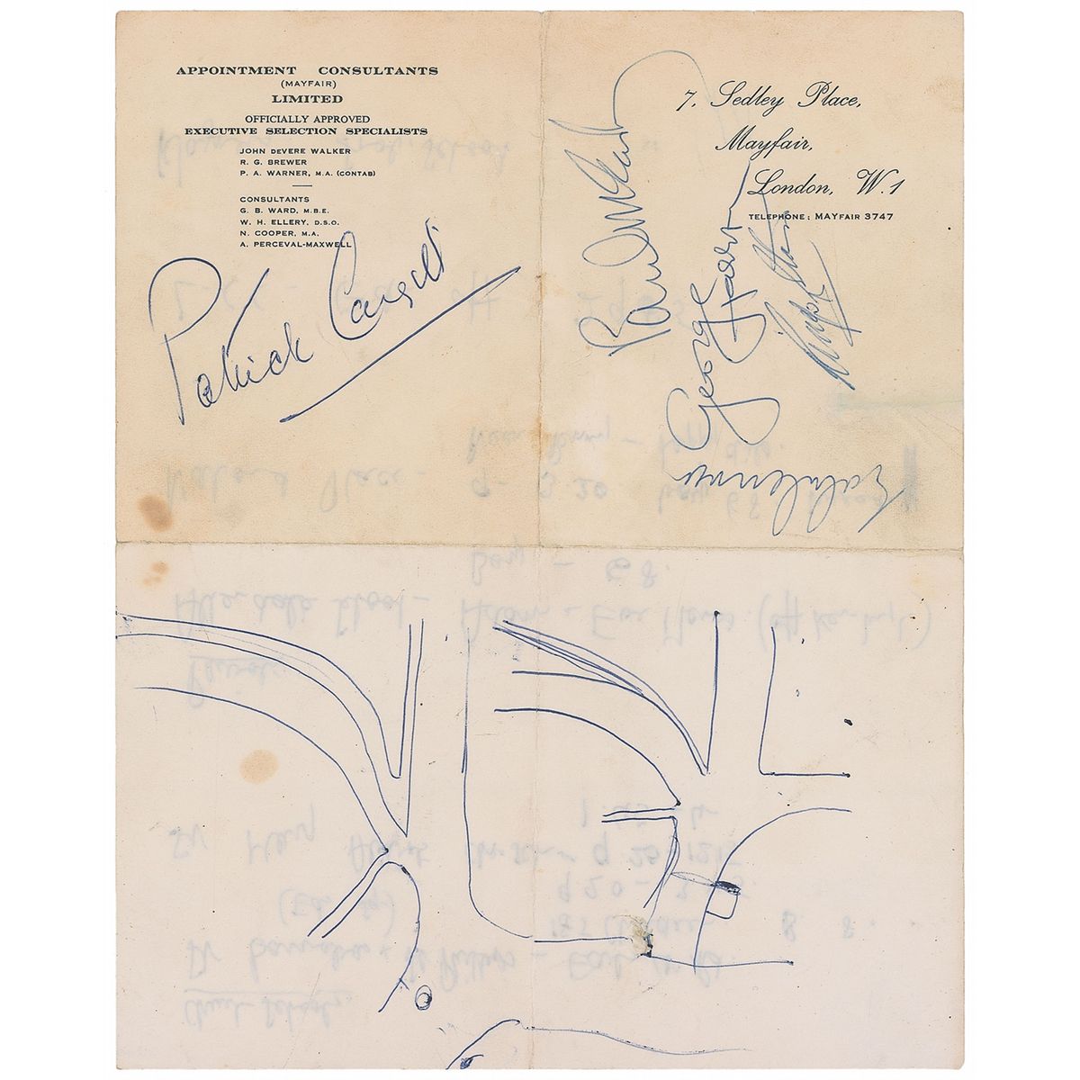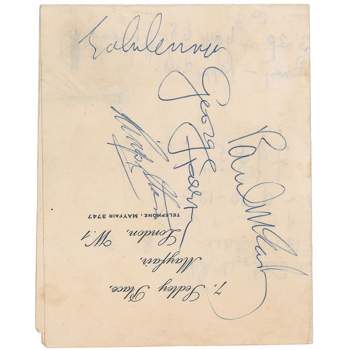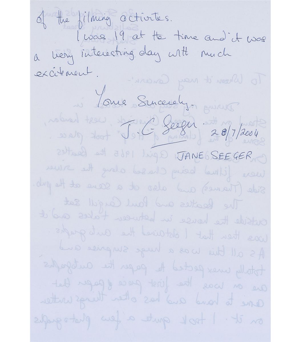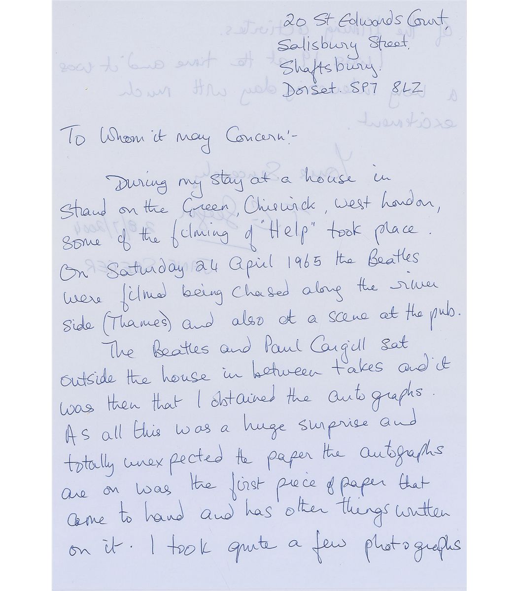 Vintage ballpoint signatures of John Lennon, Paul McCartney, George Harrison, and Ringo Starr on an off-white 5 x 4 sheet of folded business letterhead, signed while filming Help! on April 24, 1965. Also signed on the opposing side by actor Patrick Cargill, who played the superintendent in the film; an unrelated map is drawn on the lower portion of the sheet and various notes are penned on the reverse, as it was a piece of scrap paper. Light scattered staining and soiling, and show-through from notes to reverse, otherwise fine condition. Accompanied by a letter of provenance from the original recipient and a sheet showing six high-quality copies of candid photographs she took of the band members and actors on the film set. Her letter, in part: “During my stay at a house in Strand on the Green, Chiswick, West London, some of the filming of ‘Help’ took place. On Saturday 24 April 1965 the Beatles were filmed being chased along the river side (Thames) and also at a scene at the pub. The Beatles and Paul [sic, Patrick] Cargill sat outside the house in between takes and it was then that I obtained the autographs…on…the first piece of paper that came to hand. I took quite a few photographs of the filming activities.” The pub mentioned, known as The City Barge, is on the Thames. Help! was the second feature film made by the Beatles and is a comedy adventure which sees the group come up against an evil cult. A highly desirable fully signed piece with excellent provenance.