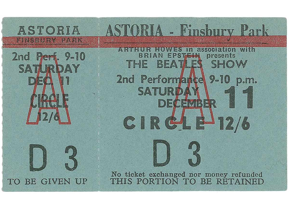 Exceedingly rare full unused concert ticket for the last show the Beatles ever played in London, 4 x 2.5, held at the Astoria Cinema at Finsbury Park on December 11, 1965. In fine condition, with mild creases and the perforation fragile but entirely intact. Given the band’s immense popularity at this time, Beatles concerts were invariably sold out, making complete tickets from this period extremely rare. This example is also historically significant, as it represents not only their final London show but their penultimate full-length concert ever performed in the UK.