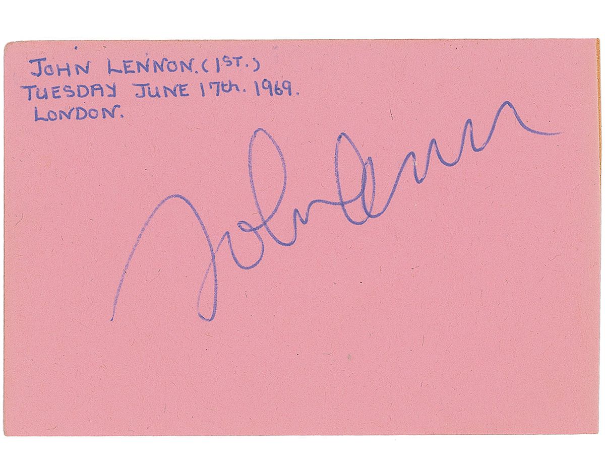 Fabulous complete set of bold ballpoint signatures from 1969, “John Lennon,” “Paul McCartney,” “George Harrison,” and “Ringo Starr,” on individual album pages, each measuring approximately 4.5 x 3.5. The Starr page is also signed by Peter MacBeth of the Foundations. All but the Harrison bear collector’s notations indicating where and when they were signed: Lennon on June 17 in London; McCartney on September 9 outside the Apple offices; and Starr on June 17 in London. Though not directly indicated on the album page, the consignor notes that Harrison signed on December 3 at Birmingham Town Hall, where he was playing with Eric Clapton and Delaney & Bonnie. In overall fine condition. Accompanied by a certificate of authenticity from Tracks. At this point in time the band was disintegrating and hardly ever found together, making it extremely difficult to assemble full set of autographs from this period.
