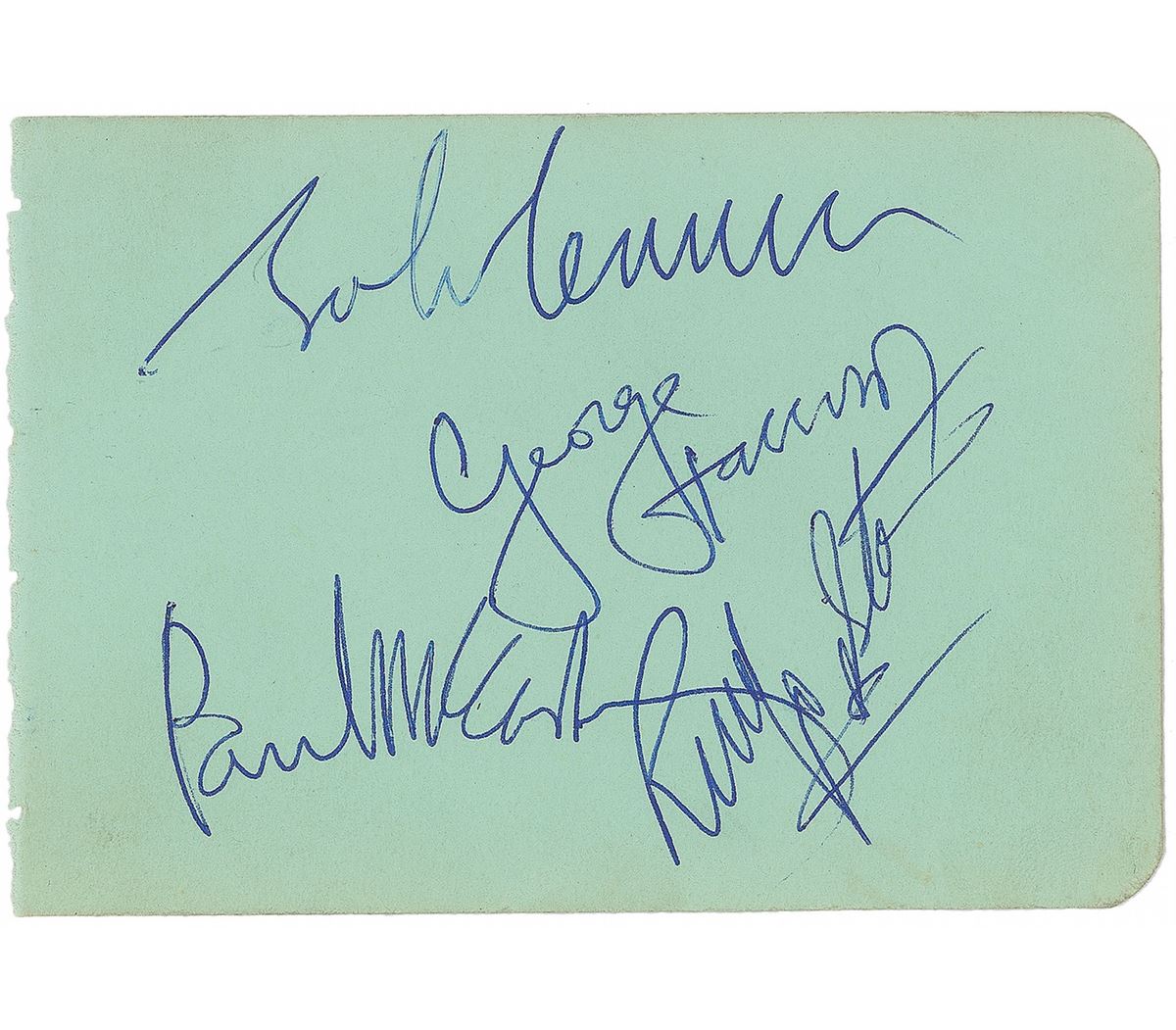 Choice vintage ballpoint signatures, “John Lennon,” “Paul McCartney,” “George Harrison,” and “Ringo Starr,” on a light green 4.5 x 3.25 album page. In fine condition, with trivial skipping to one letter of Lennon’s signature. An exceedingly desirable example as an uninscribed single page.