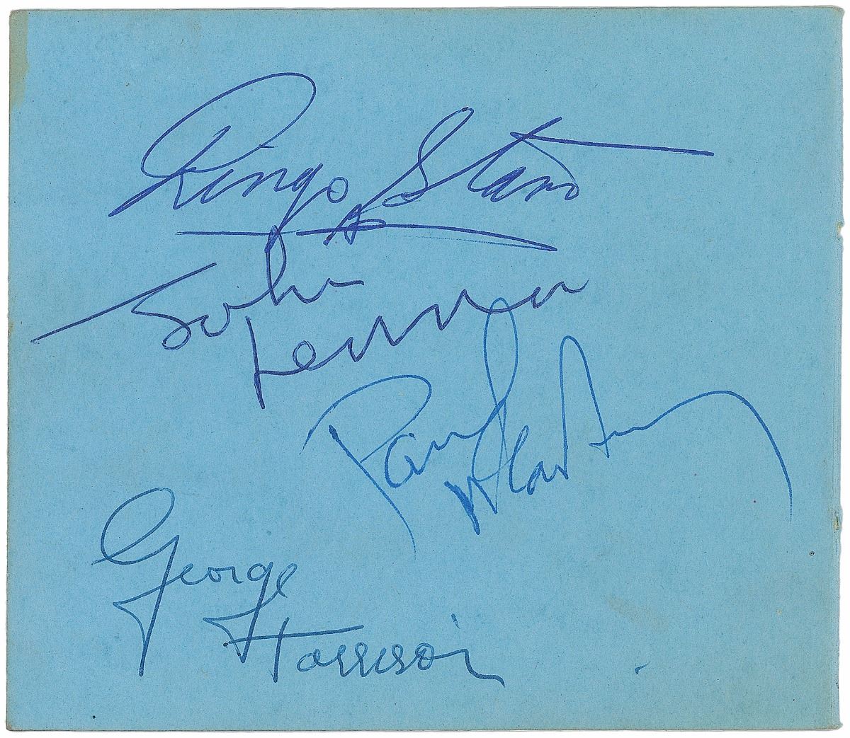 Vintage ballpoint signatures, “John Lennon,” “Paul McCartney,” “George Harrison,” and “Ringo Starr,” on a light blue 4.5 x 4 album page, signed on March 2, 1963, when they performed at Sheffield City Hall, Yorkshire, as one of the support acts on Helen Shapiro’s UK tour. In fine condition. Accompanied by a certificate of authenticity from Tracks and a letter of provenance from the original recipient, in part: “I was with a small group of girls in Sheffield by the venue and someone said that the Beatles were staying on the Grand Hotel, which was quite close by. We went to the hotel and just walking in to find the group sitting in the lounge having a coffee. The hotel manager asked us to leave but took our autograph books which were signed by the Beatles and handed back to us.”