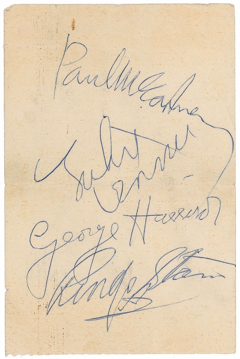 Ballpoint signatures of Paul McCartney, John Lennon, George Harrison, and Ringo Starr on an off-white 3.25 x 4.75 slip. Two horizontal folds (passing through portions of the McCartney and Lennon signatures), and some scattered soiling and creasing, otherwise fine condition. Accompanied by a letter of provenance from a previous owner who received the autographs from a Swedish pen pal during the early 1960s, in part: “He attended a party in 1963 at which the Beatles were present and obtained their autographs, which he sent to me as I guess I had mentioned I was a Beatles’ fan in my letters. Needless to say they were a welcome gift.” Months before Beatlemania swept across the United States with the band’s legendary performance on the Ed Sullivan Show, the Fab Four traveled to Sweden for a five-concert tour that showcased an edgier side of the Beatles, injecting standard rhythm and blues with a frenetic punk pace and attitude. Their television appearance on Drop In and subsequent seven-song set at Stockholm’s Karlaplansstudion secured their status among Swedish audiences.