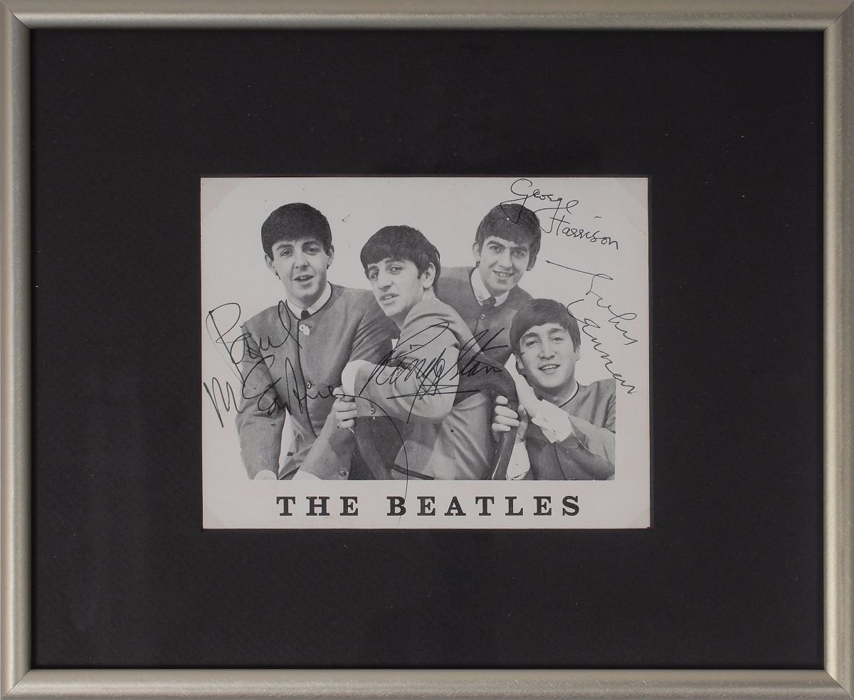 Sought-after vintage circa 1964 official Beatles Fan Club promo card depicting the group in their collarless suits, 5.25 x 4, signed in black ballpoint by John Lennon, Paul McCartney, George Harrison, and Ringo Starr. Attractively matted and framed. In fine condition. Accompanied by a certificate of authenticity from Tracks, a photocopied letter of provenance from the original recipient, and a letter of authenticity from noted Beatles expert Frank Caiazzo, in part: “This card features the famous Dezo Hoffmann ‘collarless suit pose,’ which is one of the most recognizable shots of The Beatles ever taken…This card was signed by The Beatles in February of 1964, in Miami, Florida for David Kruzel, who was a friend and neighbor of Barry Dresner. Barry’s father was police Sgt. Buddy Dresner, who was assigned protection detail for The Beatles during their entire one week stay in Miami.”