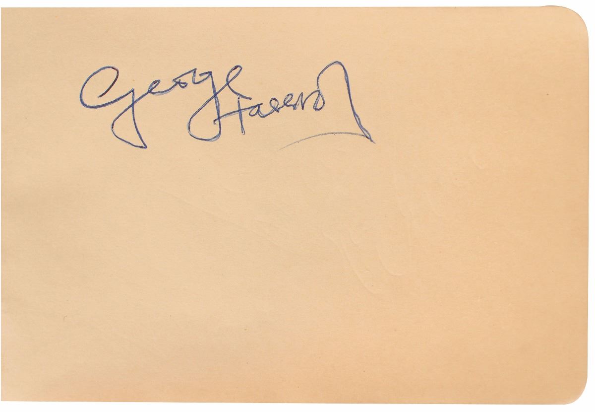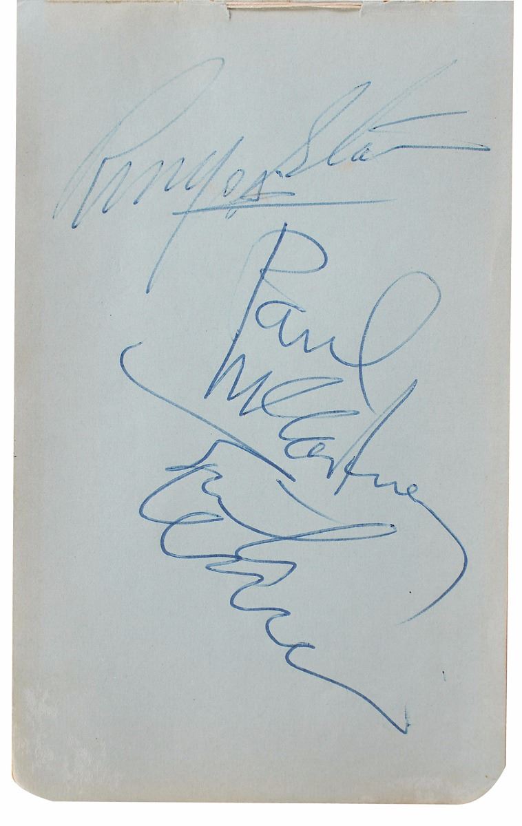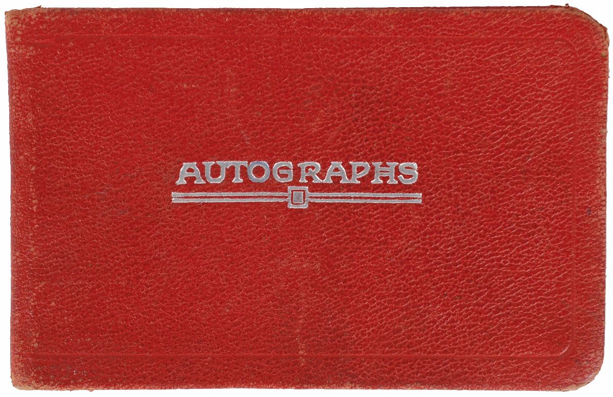Leather-bound autograph album, 5.25 x 3.25, signed inside in blue ballpoint by John Lennon, Paul McCartney, and Ringo Starr, with George Harrison signing on the following page. Harrison appears to have traced over his initial signature in an attempt to increase its boldness. In fine condition. Accompanied by an engraved nameplate indicating that the signatures were obtained at the Sheraton Hotel in Sydney on June 2, 1964.
