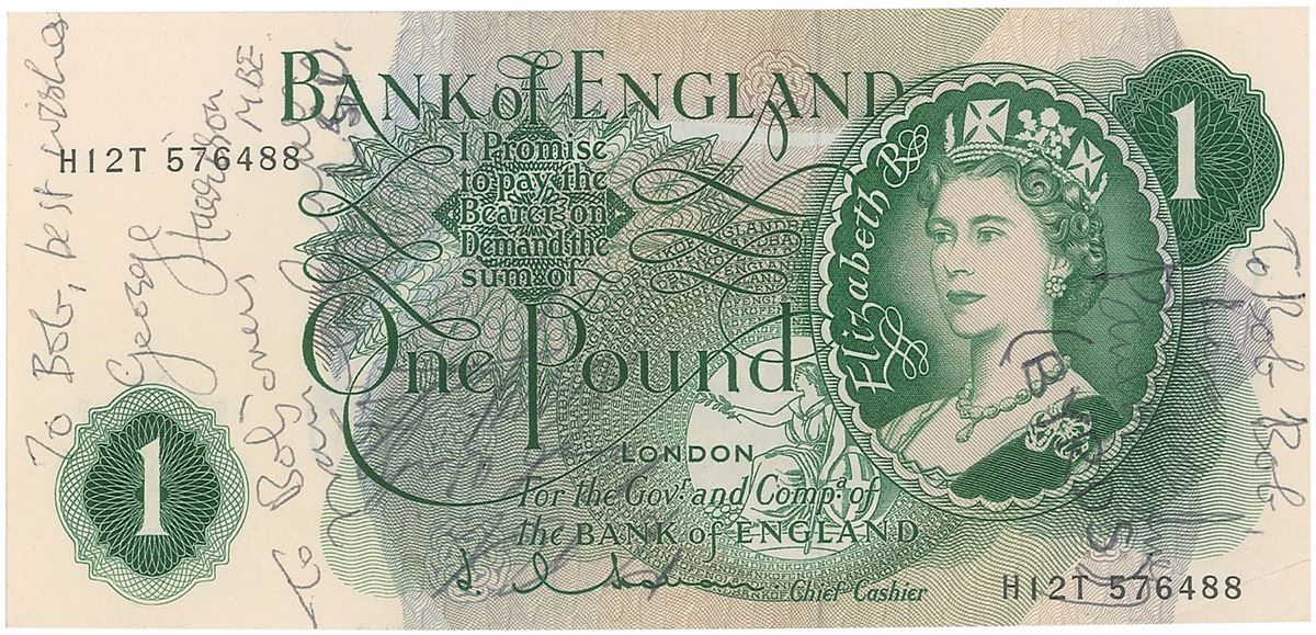 Bank of England one pound note, 6 x 2.75, signed and inscribed on the portrait side in black ballpoint, “To Bob Bob, from, Paul McCartney (BYRDS),” “To Bob, best wishes, George Harrison MBE,” “To Bob’oners, from, John Lennon LSD,” and “To Bob, best wishes, Ringo Starr.” In fine condition, with light to moderate contrast to a few signatures. Bob Bonis served as the band’s US tour manager from 1964–1966. The humorous titles added after their respective signatures, as well as the note’s recipient, add to the uniqueness of this piece, especially Lennon’s reference to the psychedelic hallucinogen, which he first tried in early 1965.