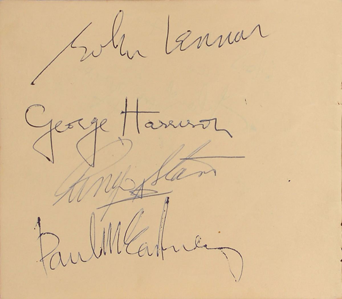 Wonderful vintage circa 1963 ballpoint signatures of John Lennon, Paul McCartney, George Harrison, and Ringo Starr on a yellow 5.25 x 4 album page still retained inside its suede softcover autograph album. In fine condition, with wear to the album’s covers. Accompanied by a certificate of authenticity from Tracks and a letter of provenance from the original recipient, in part: “When the Beatles played the Odeon in Cheltenham, November 1st 1963, (I was there) they stayed at the Savoy Hotel on Bayshill Road. Our Dad was the chef there and he got the autographs for us…The following day a report in the Daily Mirror newspaper carried the headline: ‘Beatlemania! It’s happening everywhere…even in sedate Cheltenham.’ This is believed to be the first use of the word in print; by the end of the year it would be widely used. The gig effectively kick-started Beatlemania across the UK.”