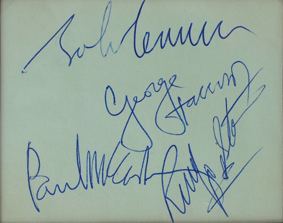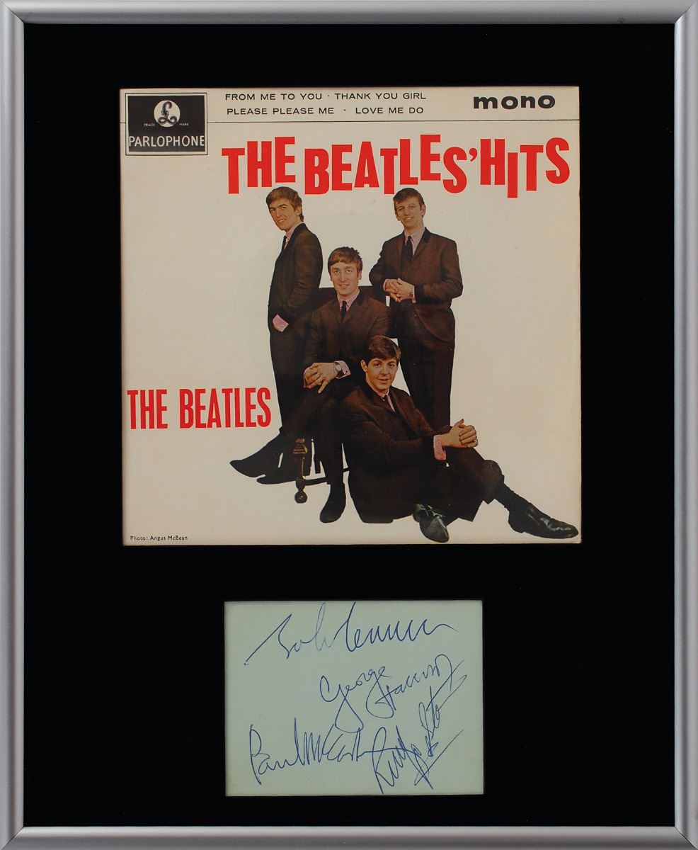 Crisp vintage ballpoint signatures of John Lennon, George Harrison, Paul McCartney, and Ringo Starr on a light green 4 x 3 album page. Framed with the 45 EP cover, The Beatles’ Hits. In fine condition. Accompanied by full letters of authenticity from REAL and noted Beatles expert Frank Caiazzo, the latter, in part: “These signatures date from late 1963/early 1964, and this is an excellent representative example of a set of Beatles autographs from that time period.”
