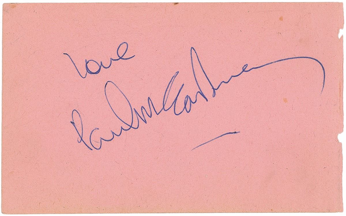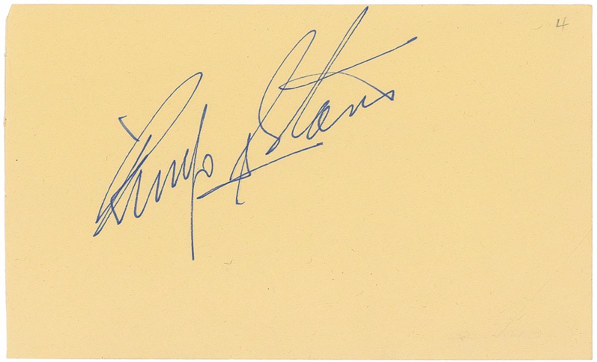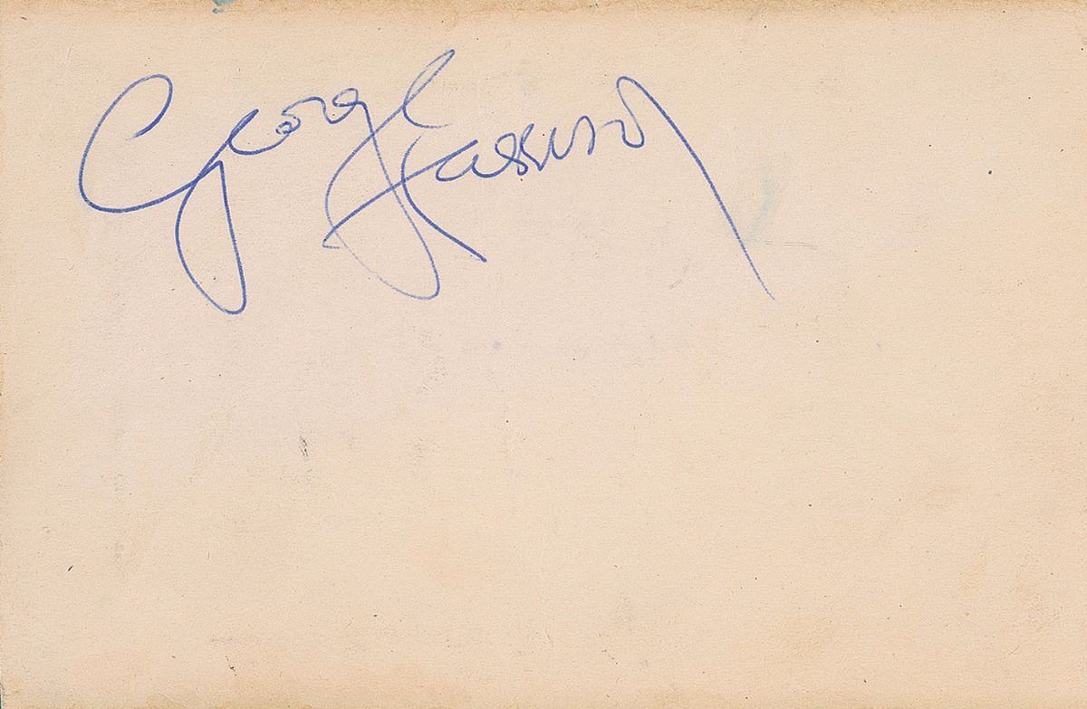 Desirable full set of blue ballpoint signatures, “John Lennon,” “Love, Paul McCartney,” “George Harrison,” and “Ringo Starr,” on individual 5 x 3 album pages removed from a hardcover autograph book. The Harrison page is affixed to what was the front cover and a few noticeable vertical creases pass through his signature, a couple spots of foxing to the McCartney page, and trivial edge toning, otherwise overall fine condition.