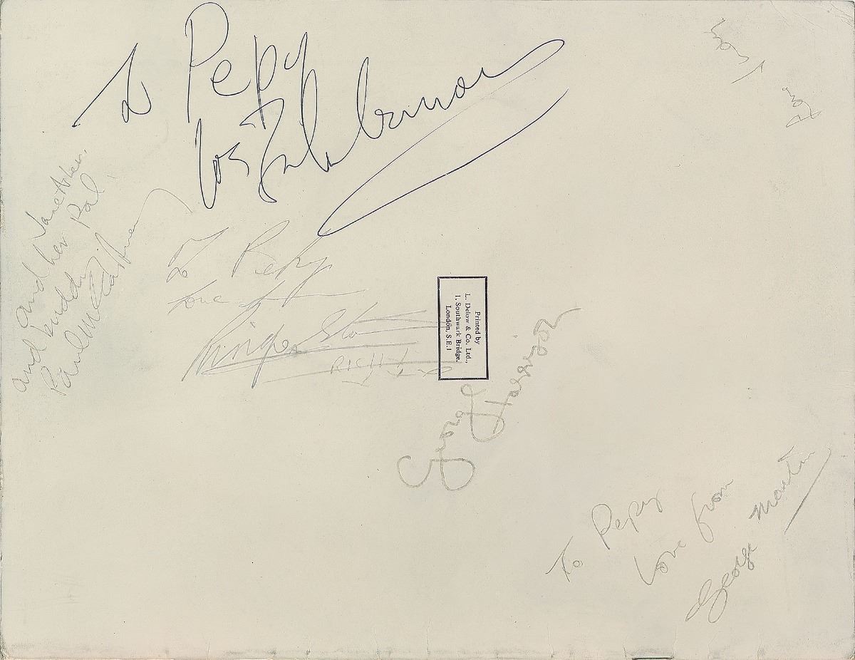 Vintage program from the royal world premiere of the Beatles’ second feature film, Help!, held at the London Pavilion in Piccadilly Circus on July 29, 1965, twenty-eight pages, 8.5 x 11, signed and inscribed on the back cover in black ballpoint, “To Pepy, love, John Lennon,” and in pencil, “Paul McCartney,” “George Harrison,” and “To Pepy, love from, Ringo Starr.” Also signed and inscribed in pencil by record producer George Martin and his future wife Judy, as well as McCartney’s girlfriend Jane Asher, with McCartney adding below her signature, “and her pal and buddy.” Program also bears an unidentified pencil signature below the Starr signature. The front cover has a long diagonal crease and exhibits general handling wear; the signed back cover has been professionally cleaned and restored to fine condition. Accompanied by a letter of authenticity from noted Beatles expert Frank Caiazzo, in part: “Signed programs from this event are extremely rare, and only a handful has turned up in the 40 years since this event took place.” Inspired by the Goon Show and the Marx Brothers classic Duck Soup, Help! saw the Fab Four tackling comedy with a James Bond twist, fending off an evil cult from seizing a sacrificial ring attached to Ringo’s hand. The enormous premiere was attended by Princess Margaret, Countess of Snowdon and the Earl of Snowdon, and despite not earning as rave reviews as A Hard Days Night, the film has since been credited for influencing the development of music videos. A truly rare, multi-signed piece of Beatles history.