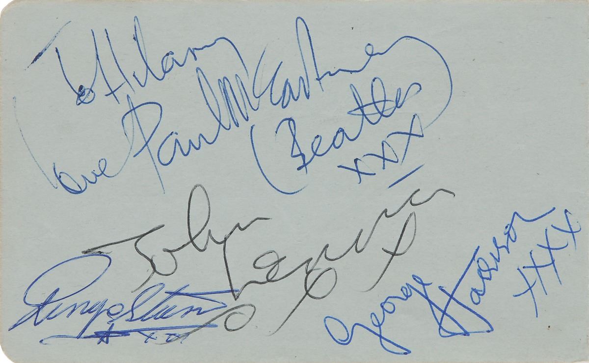 Vintage ballpoint signatures and inscription, “To Hilary, love Paul McCartney (Beatles), xxx,” “John Lennon, xx,” “George Harrison, xxxx,” and “Ringo Starr, xxx,” on a light blue 5 x 3 album page. In fine condition.