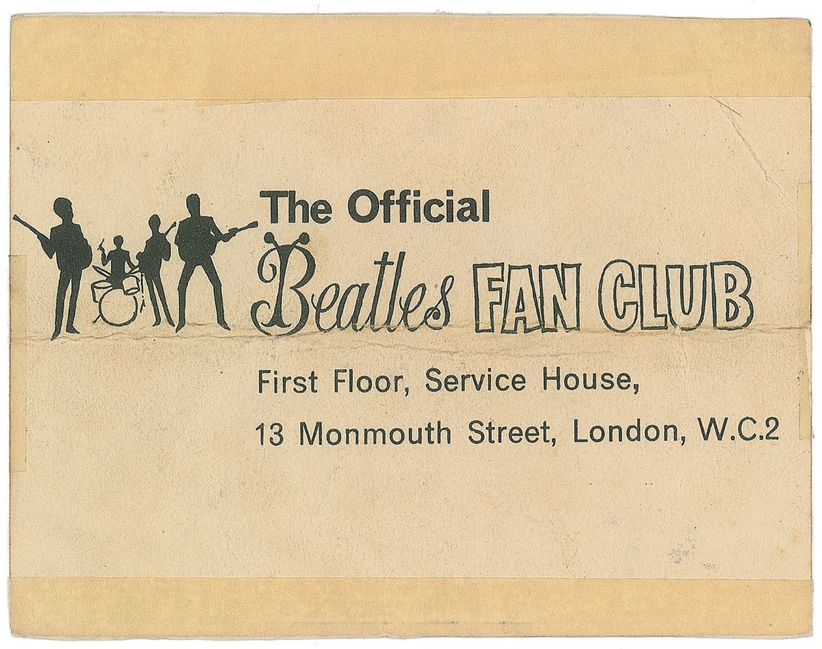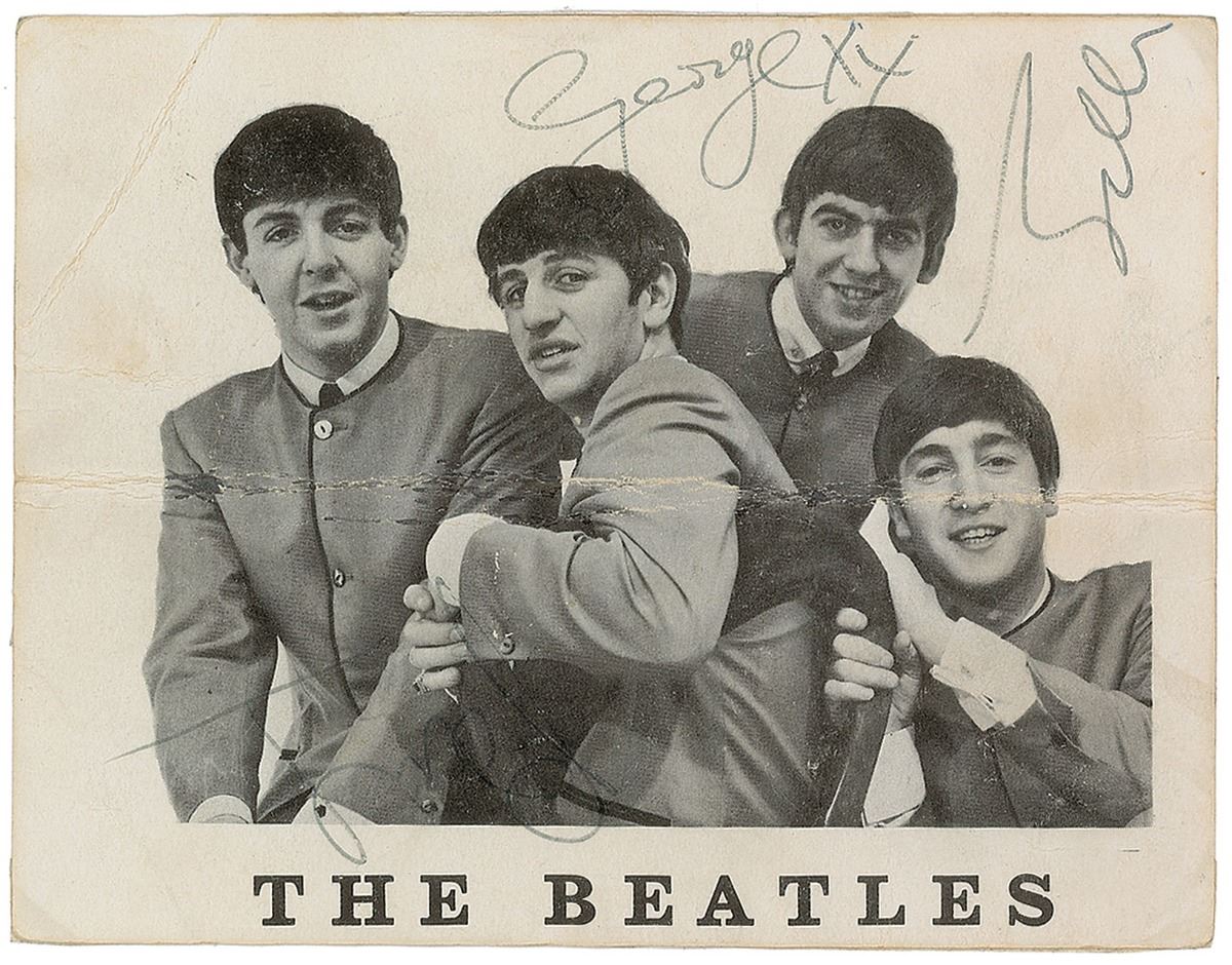 Sought-after vintage circa 1964 official Beatles Fan Club promo card depicting the group in their collarless suits, 5.5 x 4.25, signed in black ballpoint, “John,” “Paul,” and “George xx.” In very good condition, with a heavy central horizontal crease, a few lighter creases, mild soiling, and mounting remnants to reverse. An appealing set of the three most sought-after Beatles.