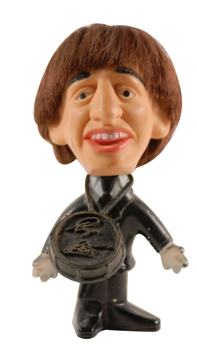 Uncommon full lineup of hard-bodied Remco dolls with rooted hair and matching black suits, each approximately 4.5? tall and holding an instrument bearing an embossed facsimile signature. In overall fine condition. Produced in 1964, the Remco figures were some of the more popular licensed Beatles items.