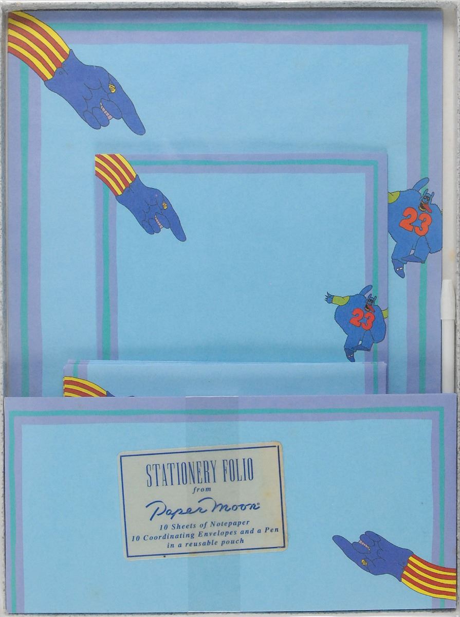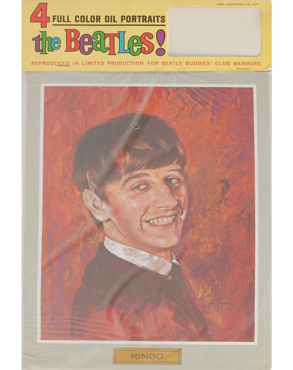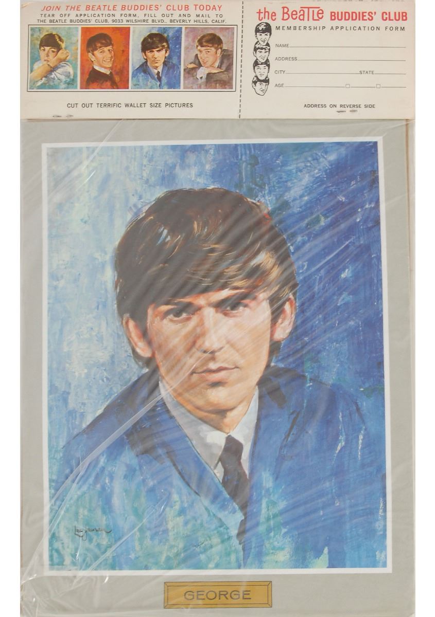 Two items: a Yellow Submarine stationery ranging in size from 6 x 4.5 to 8 x 11 housed in its original box, produced by Paper Moon in 1988, includes 12 large and 7 small envelopes, 12 large and 7 small sheets of stationery, original pen, and reusable plastic storage pouch in the original stationery box; and an unopened set of four color 9 x 12 portraits produced in “limited production for Beatle Buddies’ club members,” issued by Nems Enterprises, Ltd., London. Top of package originally would have included a club membership card, which has since been removed. In overall very good to fine condition.